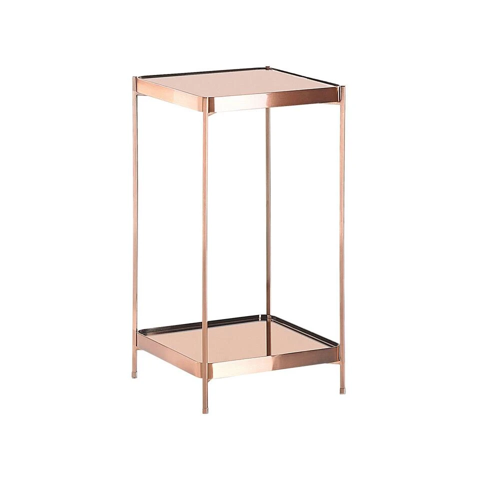 Vierkante bijzettafel in koper. Geef je woonkamer een vleugje elegantie met deze glamoureuze bijzettafel. De tafel heeft een vierkant tafelblad van gehard glas, stevige metalen poten en een lage, extra opslagruimte waarin boeken, tijdschriften etc. opgeborgen kunnen worden. Deze bijzettafel past perfect naast je bank, chaise longue of fauteuil.