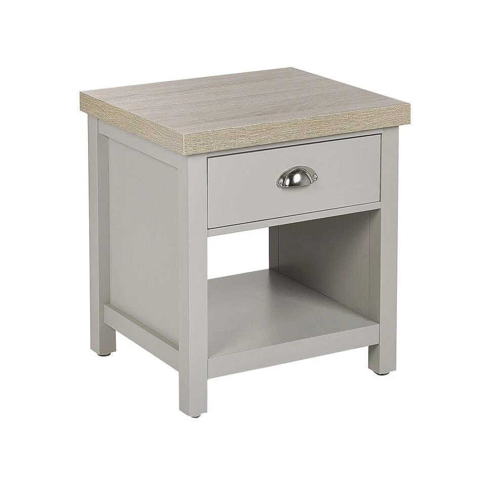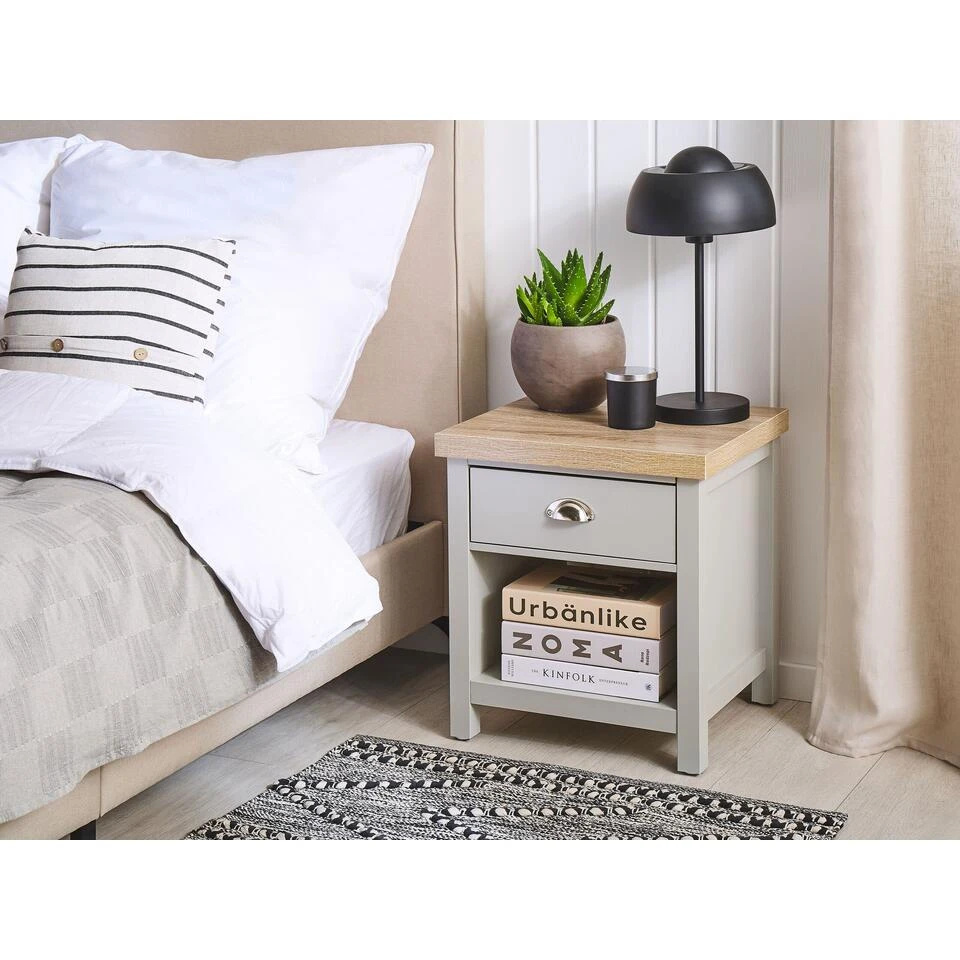 Modern nachtkastje met opbergruimte. Dit stijlvolle nachtkastje is een nuttig meubelstuk waardoor je een klein nachtlampje en diverse benodigdheden in je slaapkamer binnen handbereik kunt hebben. De ruime laden bieden extra ruimte voor boeken en opladers voor mobiele telefoons. Dankzij zijn afwerking en tint past het uitstekend in zowel Scandinavische als traditionele interieurs.