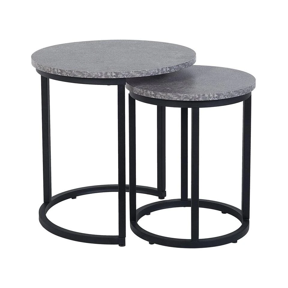 Praktische set van 2 bijzettafels in een moderne look. Een praktische verrijking voor elk huis. Dankzij deze twee ronde bijzettafels heb je meer ruimte voor jouw decoratieve items, bloemen of andere kleine dingen. Of het nu gaat om een kleine salontafel in de woonkamer of als opbergruimte in de entree, individueel of samen – deze set vervult zijn functie overal. De set fascineert ook door het moderne uiterlijk.