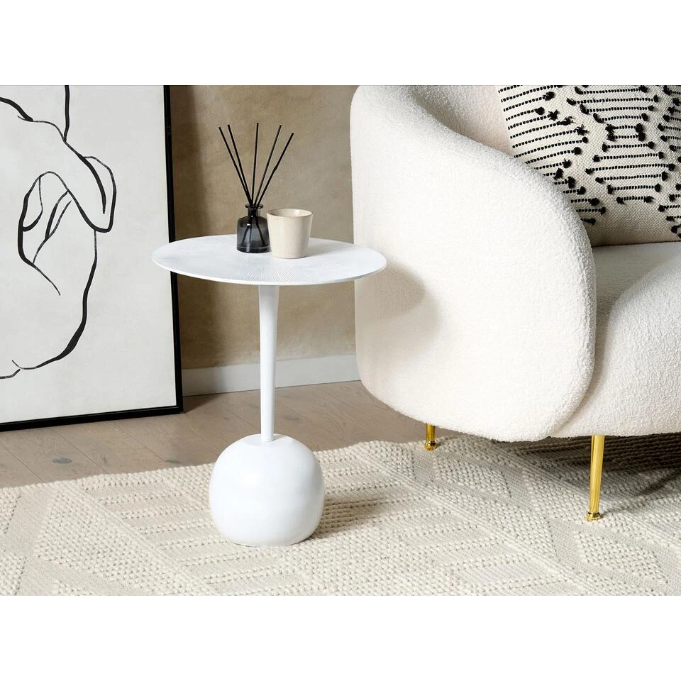 Moderne bijzettafel met matte afwerking. Deze minimalistische bijzettafel is een prachtige en ongebruikelijke toevoeging aan elk interieur in een moderne en Scandinavische stijl. Het zal dienen als een geweldige plek om een bedlampje en een fotolijst in de slaapkamer neer te zetten, evenals tijdschriften of boeken in de woonkamer. Het is gemaakt van duurzaam aluminium, vereist geen speciaal onderhoud en is stabiel en solide. Houtsnijwerk op een zwarte, matte top maakt het geheel een lust voor het oog.