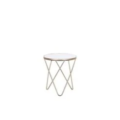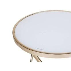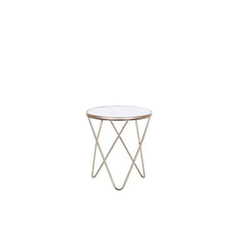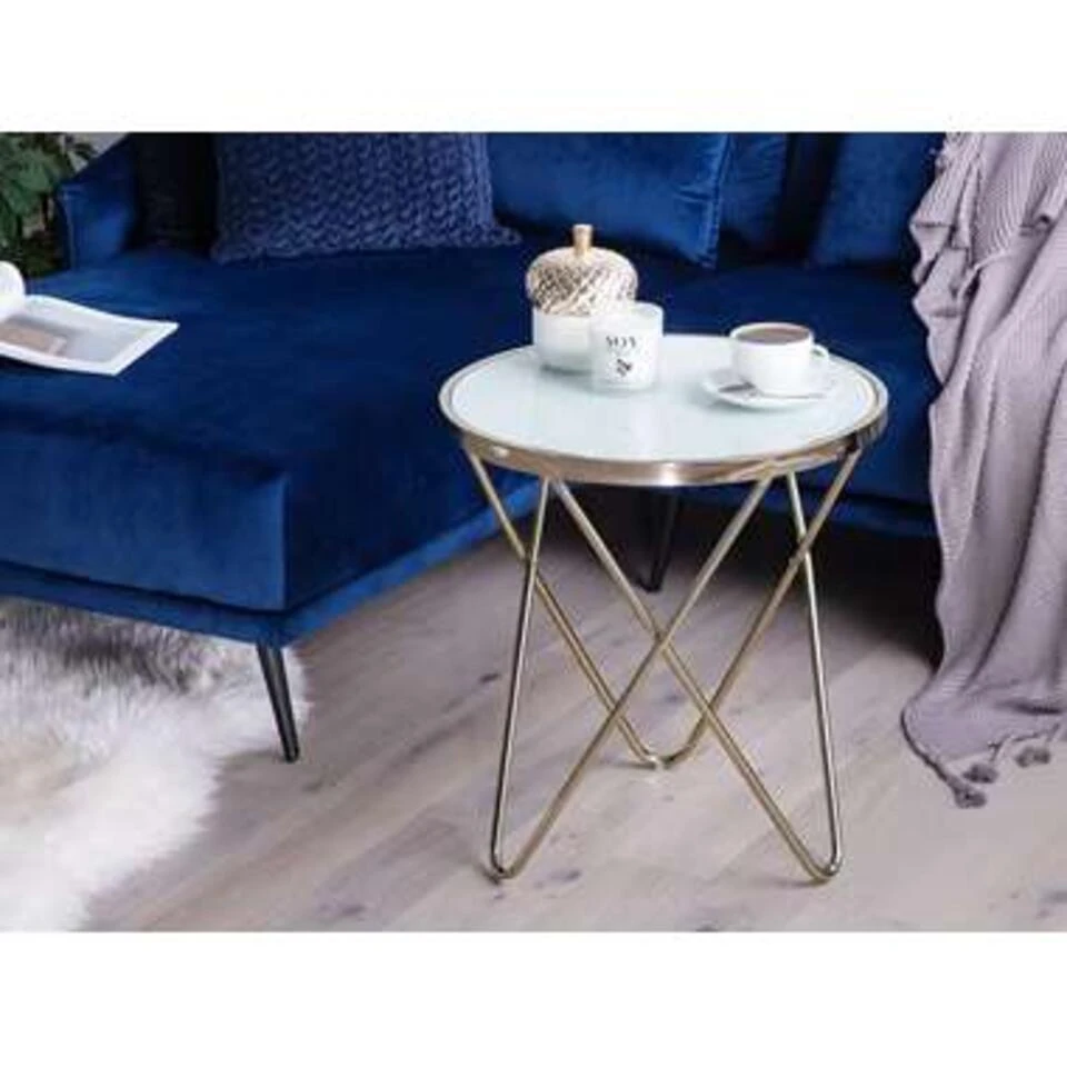Moderne bijzettafel in wit en goud. Deze mooie tafel kan universeel worden gebruikt en kan in je woon- en werkruimte worden gebruikt als bijzettafel of salontafel. Dankzij het gekruiste, V-gevormde onderstel en de ronde boven plaat in wit geeft het een moderne en elegante uitstraling. De metalen constructie geeft het voldoende stabiliteit en straalt ook in een mooi goud.