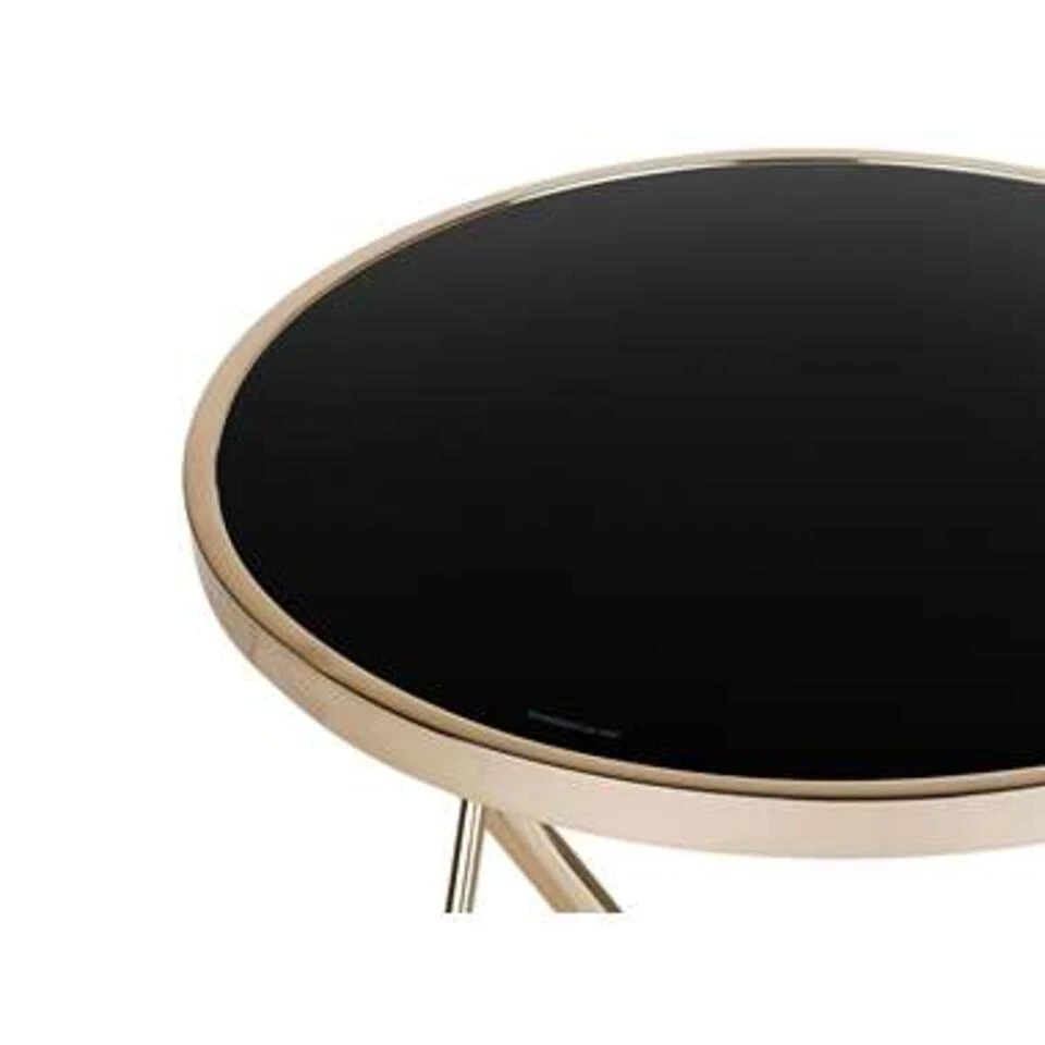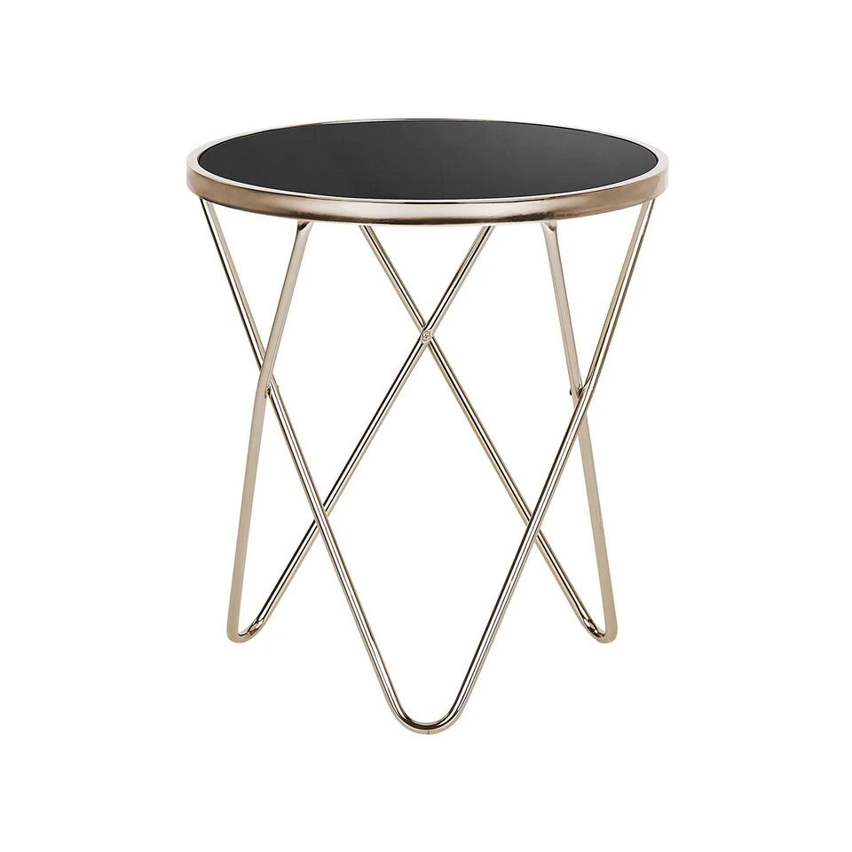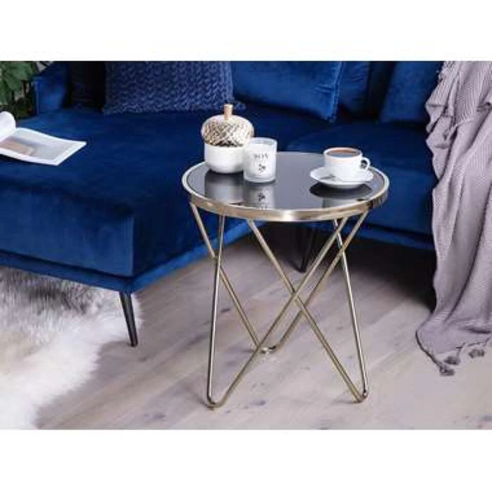 Moderne salontafel in zwart en goud. Deze mooie tafel kan universeel worden gebruikt en kan in je woon- en werkruimte worden gebruikt als bijzettafel of salontafel. Dankzij het gekruiste, v-gevormde onderstel en de ronde bovenplaat in zwart geeft het een moderne en elegante uitstraling. De metalen constructie geeft het voldoende stabiliteit en straalt ook in een mooi goud.