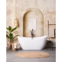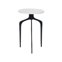 Glamour bijzettafel. Een minimalistische en toch elegante uitstraling zijn de twee belangrijkste kenmerken die deze bijzettafel kenmerken. Het marmeren blad met een natuurlijke afwerking in een universele kleur maakt het geschikt voor veel interieurs, vooral moderne en die in Scandinavische stijl. De stabiliteit van de hele structuur wordt verzekerd door zwarte metalen poten, die alleen nog maar geplaatst hoeven te worden om het product gebruiksklaar te maken. Fris de look van je woon- of slaapkamer op en zet je favoriete accessoires erop.