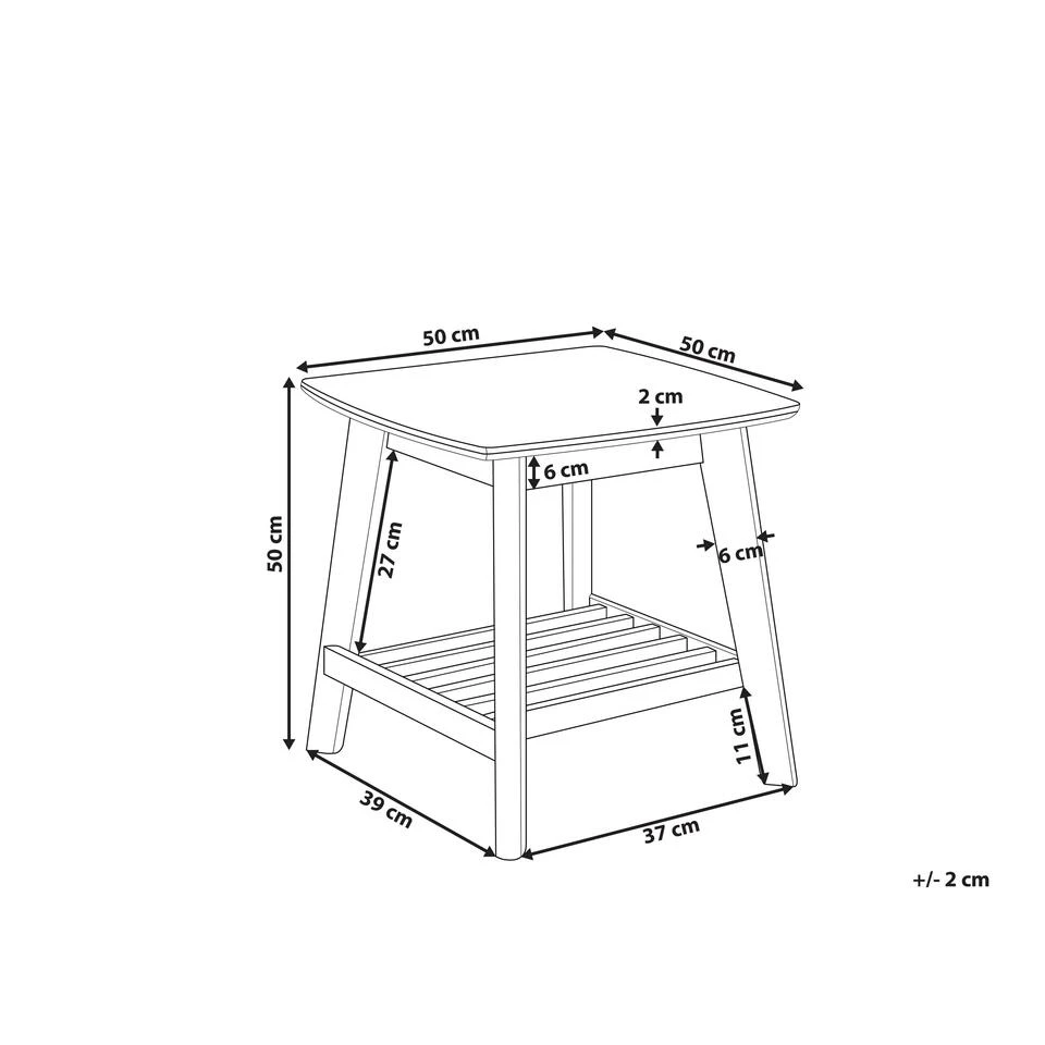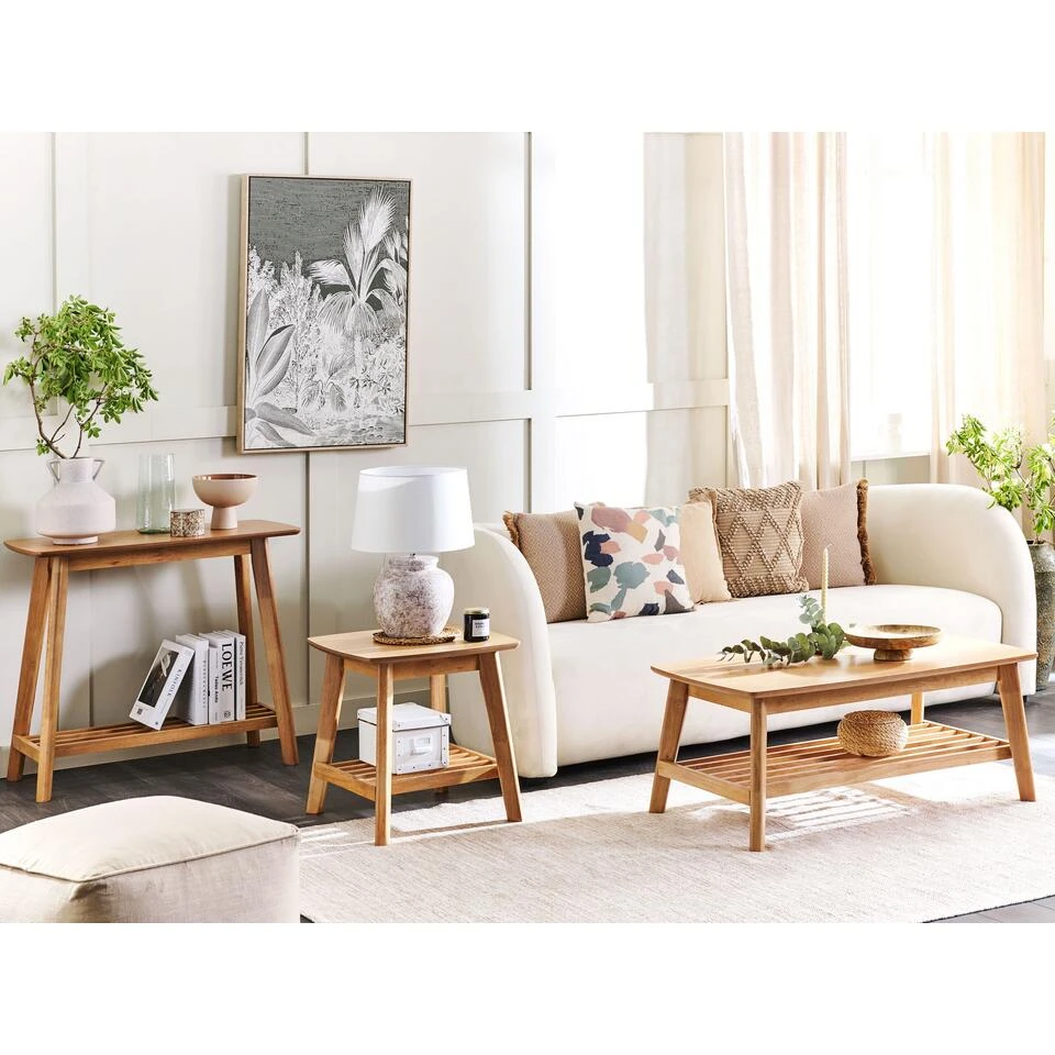 Stevige, vierkante salontafel met praktische opberger in natuurlijke houtlook. Als je op zoek bent naar een meubel dat orde brengt in de woon- of eetkamer, of als je op zoek bent naar stijlvol bijzetmeubel voor in de gang, dan is dit model de juiste keuze. De stevige salontafel is gemaakt van hoogwaardige materialen, vereist minimaal onderhoud en is bijzonder stabiel dankzij de rubberhouten poten. De tafel heeft ook een praktische plank met een stijlvolle latten-look, waarop je boeken, afstandsbedieningen of andere kleine spullen kunt plaatsen. Zowel het tafelblad in houtlook als de houten constructie betoveren met hun matte afwerking.