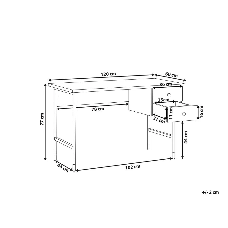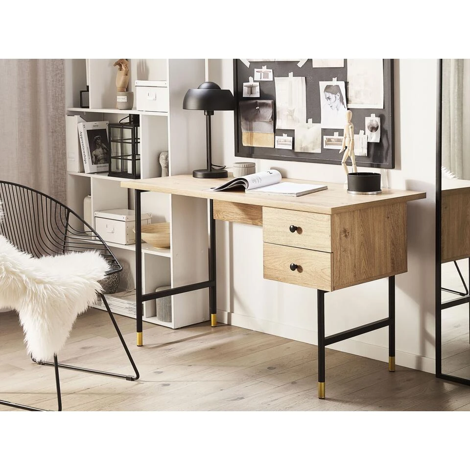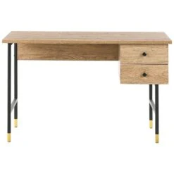 Trendy bureau in een industrieel design. De ruime opbergruimte en de twee lades van dit bureau in natuurlijke houtlook bieden voldoende ruimte voor kantoorbenodigdheden, pennen en documenten. De robuuste maar tegelijkertijd smalle poten van gepoedercoat metaal in zwart geven het meubel een zekere lichtheid en geven de kamer een decoratief accent.