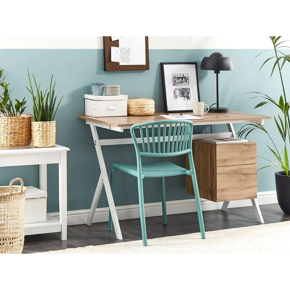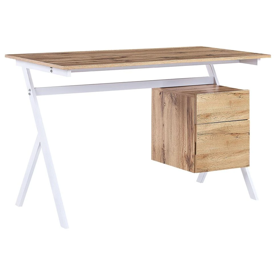 Bureau met Opbergruimte in Scandinavisch Design. Dit klassieke bureau zal een echt pronkstuk zijn in elk Scandinavisch interieur. Het frame is gemaakt van robuust staal, bedekt met een witte poedercoating voor een langdurig effect. Het MDF-blad imiteert hout in een lichte tint. Het meubel wordt geleverd met een softclosing opberglade en een kastje voor al je dossiers, notitieblokken en kantoorbenodigdheden.
