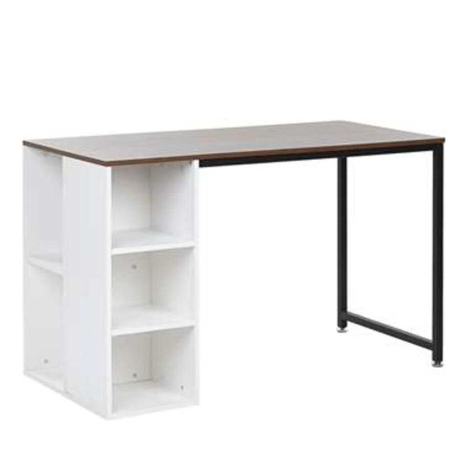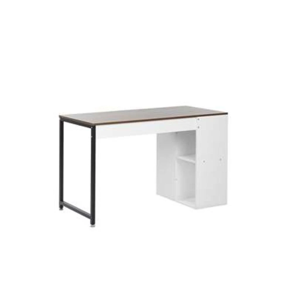 Praktisch bureau met ruimtebesparende planken. Dit bureau, geïnspireerd door Scandinavische en industriële trends, past perfect bij een breed scala aan moderne en traditionele designstijlen. Het blad van bewerkt hout heeft een mooie houtlook afwerking in een donkere tint. Praktische planken zorgen voor een moeiteloze organisatie van de ruimte, waardoor je nog efficiënter kan studeren of werken. Verstelbare poten zorgen voor een perfecte balans, zelfs op een oneffen vloer.