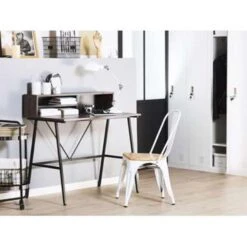 Minimalistisch bureau in donkerbruin met opbergruimte. Dit bureau is enorm elegant, met daarnaast voldoende ruimte voor je boeken en schrijfgerei door middel van een open compartiment met een kleine plank. Het minimalistische design past perfect in moderne woonstijlen en neemt door zijn afmetingen weinig ruimte in beslag, zodat je ook in kleinere ruimtes een werkhoek kunt inrichten.