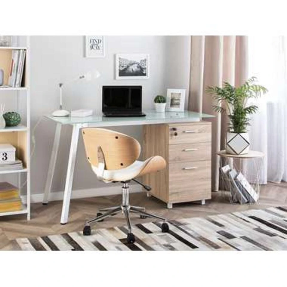 Modern, stijlvol bureau. Werk in stijl – dit bureau heeft een moderne uitstraling die past bij elke woon- en werkruimte. De combinatie van glas en hout op een metalen constructie geeft het meubilair een chique lichtheid. Daarnaast heeft de tafel een praktische kast met laden, waarin je alle soorten kantoorbenodigdheden kunt opbergen.