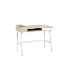 Multifunctioneel bureau in minimalistisch design. Veelzijdig en stijlvol – dit bureau met twee ruime laden biedt voldoende ruimte voor allerlei soorten kantooraccessoires. De lange, smalle poten in bruine houtkleur contrasteren mooi met de witte kleur van het werkblad en de laden. Het bureau past in zowel moderne als klassieke interieurstijlen.