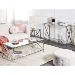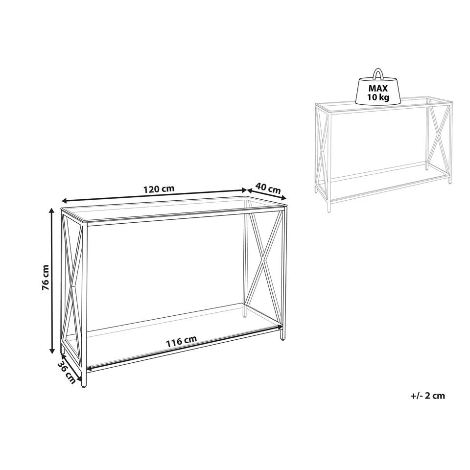Moderne console tafel met plank. Deze minimalistische console tafel zal een opvallende aanvulling zijn voor moderne, Scandinavische en industriële interieurs. Het is gemaakt van gehard glas en roestvrij staal waardoor het stabiel en duurzaam is. De tafel kan gebruikt worden als kaptafel in de slaapkamer of een tafel voor bloemen en fotolijstjes in de woonkamer of hal. De tafel vereist geen speciaal onderhoud en zal je vele jaren charmeren.