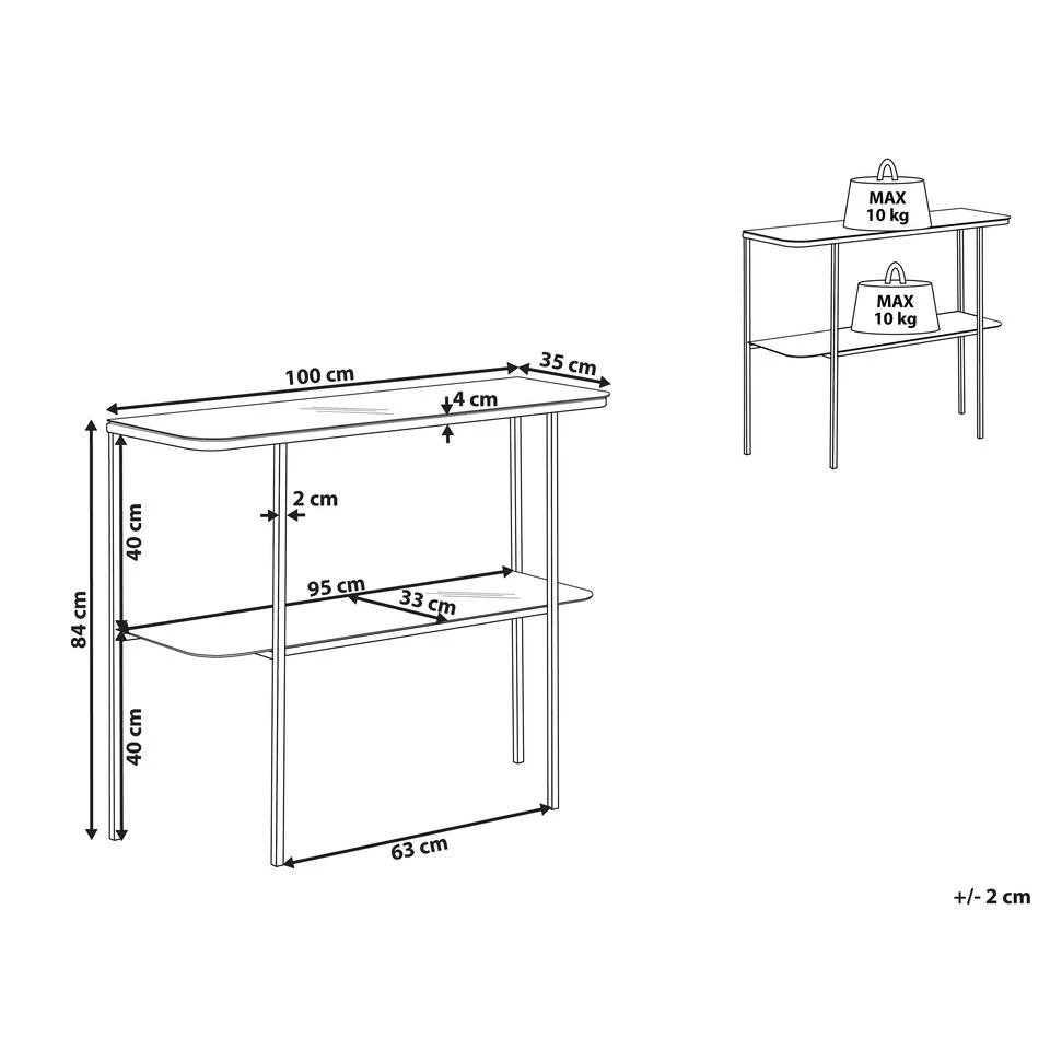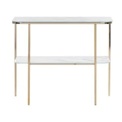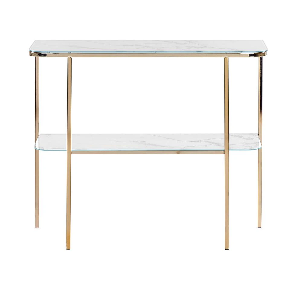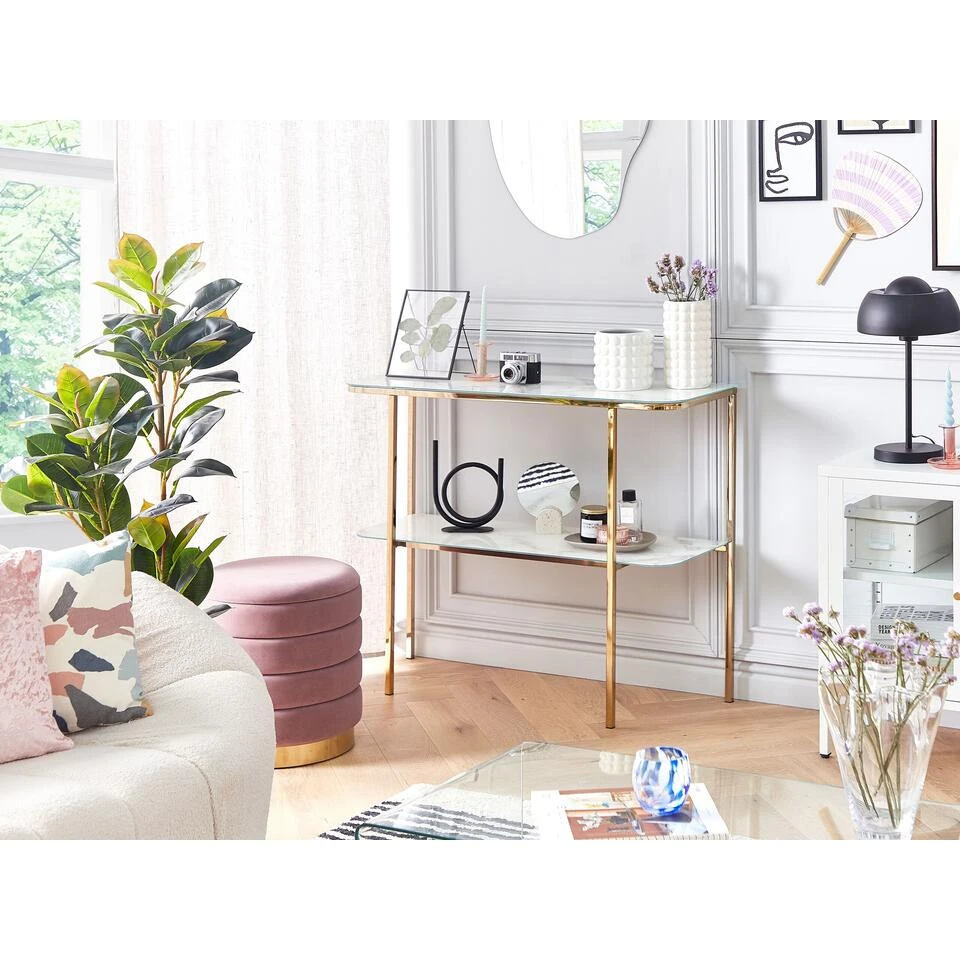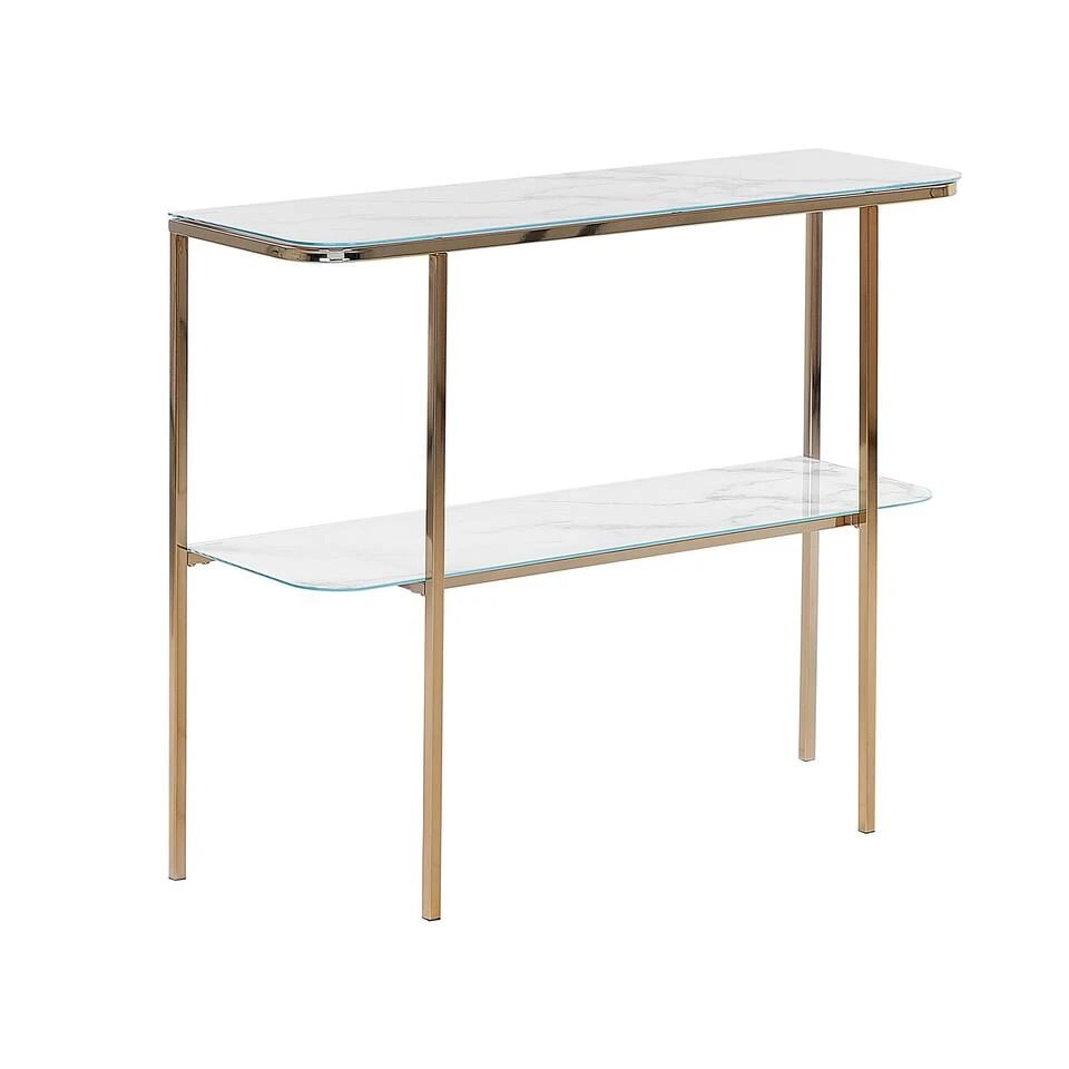 Glamour kaptafel met marmereffect en extra plank. Breng elegantie en functionaliteit in je leefruimte met deze glamoureuze consoletafel. De twee marmeren glazen planken verrijken je woonkamer, hal of slaapkamer. Ook biedt het meubel voldoende ruimte om siervazen tentoon te stellen of om de spullen die je bij de hand wilt hebben te ordenen. De stabiele poten met glanzende afwerking complementeren het elegante totaalbeeld van het meubel.