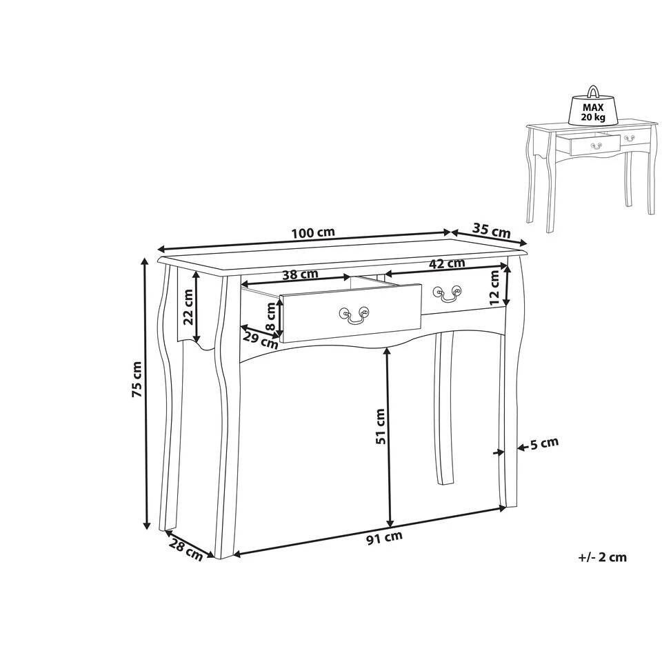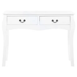 Consoletafel in landelijke stijl. Deze rustieke tafel is een functionele en decoratieve toevoeging aan elke hal of woonruimte en vormt een ideale achtergrond voor boeken, decoraties en persoonlijke stylingaccenten. Met een slank ontwerp met cabrioletpoten en een geschulpte voorkant, biedt dit stuk een vintage, tijdloze uitstraling. Uitgerust met twee ruime lades, beide versierd met klassieke metalen handgrepen, past deze tafel perfect bij elke Franse landelijke stijl en luxe inrichting.