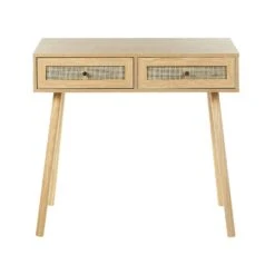Stijlvolle tafel met rotan fronten. De consoletafel in een lichte houttint past perfect bij een woonkamer en gang in natuurlijke, boho- of traditionele stijl. Het is gemaakt van hoogwaardig spaanplaat en wordt geleverd met houten poten voor stabiliteit. De praktische lades zijn gedecoreerd met rotanweefsel dat een unieke charme toevoegt aan de consoletafel.