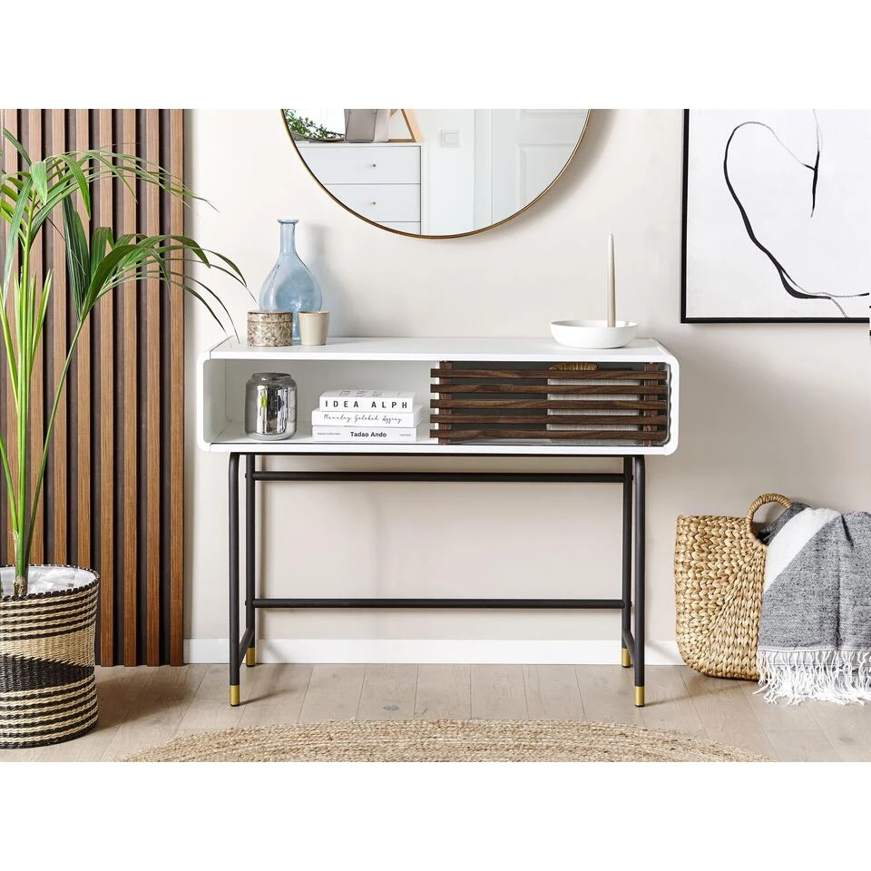 Rustiek dressoir in donker hout-look met 2 schuifdeuren. Een functioneel meubel dat perfect in elke woonruimte past. De kast heeft vier diepe planken, die kunnen worden verborgen of opengelaten met behulp van een van de 2 schuifdeuren – zodat je niet alleen orde creëert, maar ook een trendy retro-look. Plaats dit model naast een gekleurde bank om een uitnodigende feel-good sfeer te creëren dankzij de moderne hout-look en de speciale latten fronten.