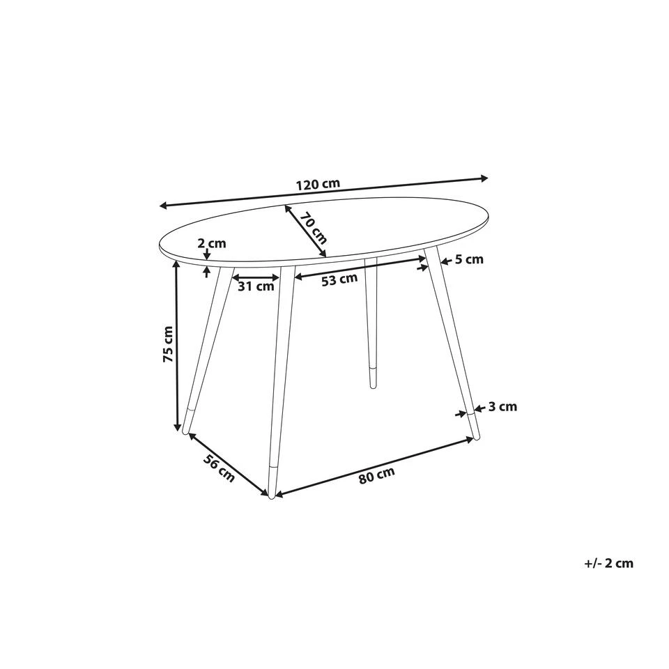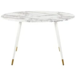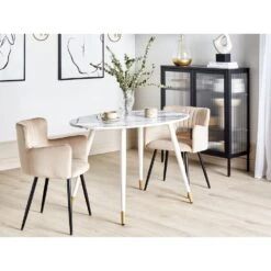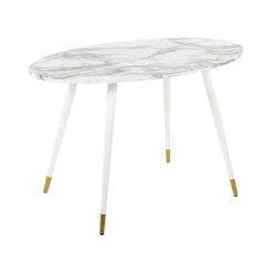 Ovale tafel. Zet deze tafel in je eetkamer of keuken en voeg een glamour gevoel toe aan je interieur. De tafel is gemaakt van hoogwaardig MDF en staat stevig op zijn ijzeren poten. Vereist weinig onderhoud. De kleuren combinatie en het marmer effect in wit met gouden poten zal zeker opvallen in verschillende moderne interieurs.