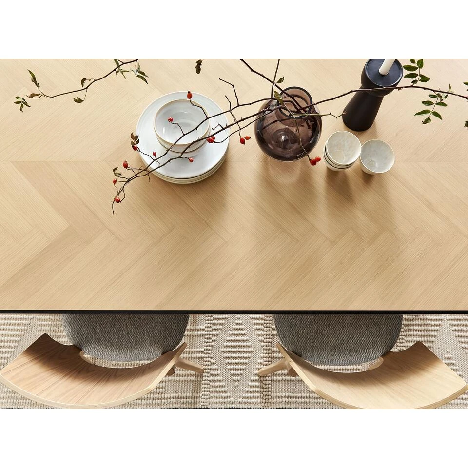 Traditionele rechthoekige eettafel. Deze rechthoekige eettafel combineert Scandinavische stijl met klassieke elegantie. Het tafelblad in een lichte houttint wordt geaccentueerd door slanke zwarte poten, gemaakt van rubberhout. Vul de tafel aan met gestoffeerde of houten stoelen om je eetkamer een unieke uitstraling te geven.