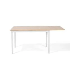 Eettafel met uitklapbaar tafelblad. Deze elegante tafel verrast door zijn multifunctionaliteit en past zich perfect aan je wensen aan. De tafel heeft een verlengstuk aan de zijkant, zodat je meer ruimte en comfort heeft. Hij wordt gekenmerkt door een rustieke charme in de natuurlijke houtkleur, en de poten zorgen voor een klassiek kleurcontrast. De tafel kan zowel in de eetkamer, keuken of studeerruimte worden gebruikt, en past bijzonder goed bij moderne, rustieke en landelijke stijlen.