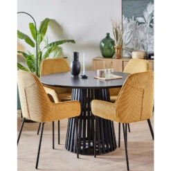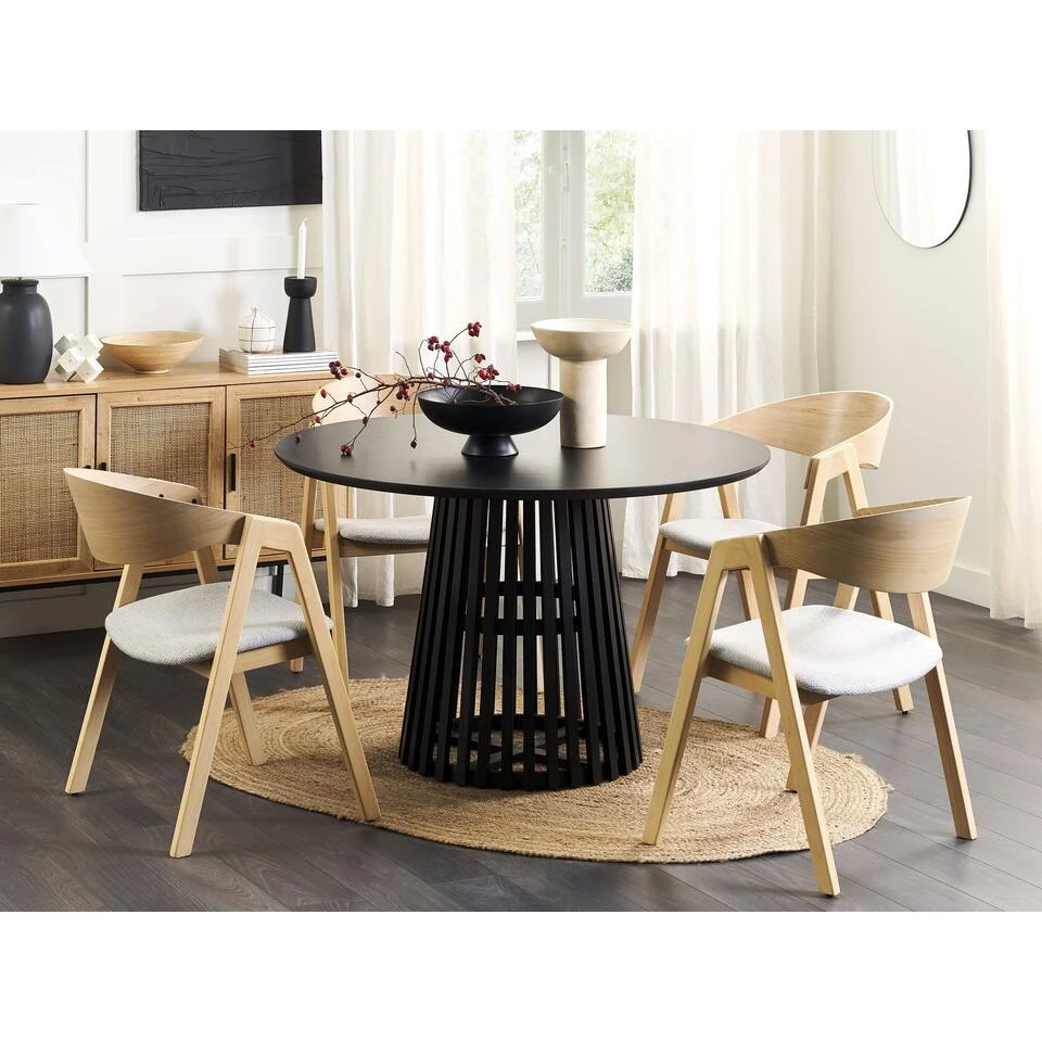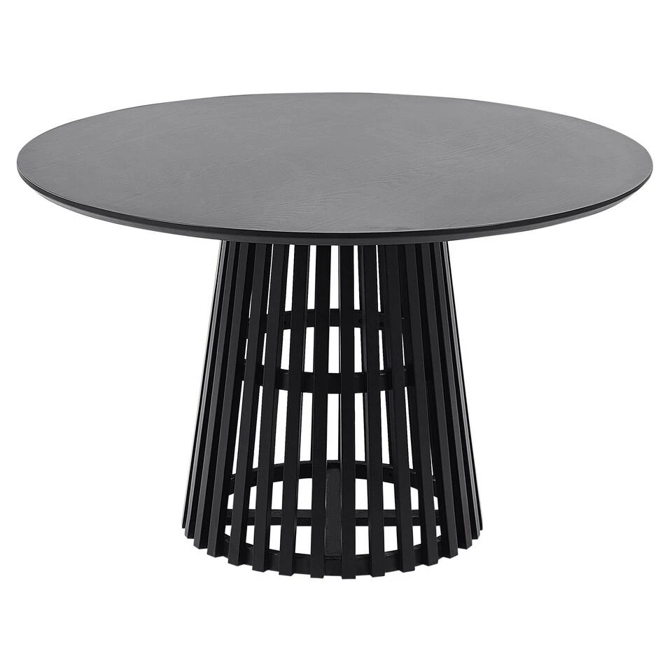 Moderne tafel voor 4 personen. Fris je eethoek op met deze stijlvolle, moderne tafel. Het meubel biedt comfortabel plaats aan maximaal 4 personen en biedt ze voldoende ruimte voor borden en drankjes. Het is gemaakt van MDF, waardoor het onderhoudsarm en gemakkelijk schoon te maken is. De unieke lattenbodem, die zeker de aandacht trekt, is gemaakt van duurzaam rubberhout, waardoor de hele constructie stabiel is. Dankzij de zwarte kleur kan de tafel worden gecombineerd met verschillende interieurs en ziet hij er in alle interieurs geweldig uit.