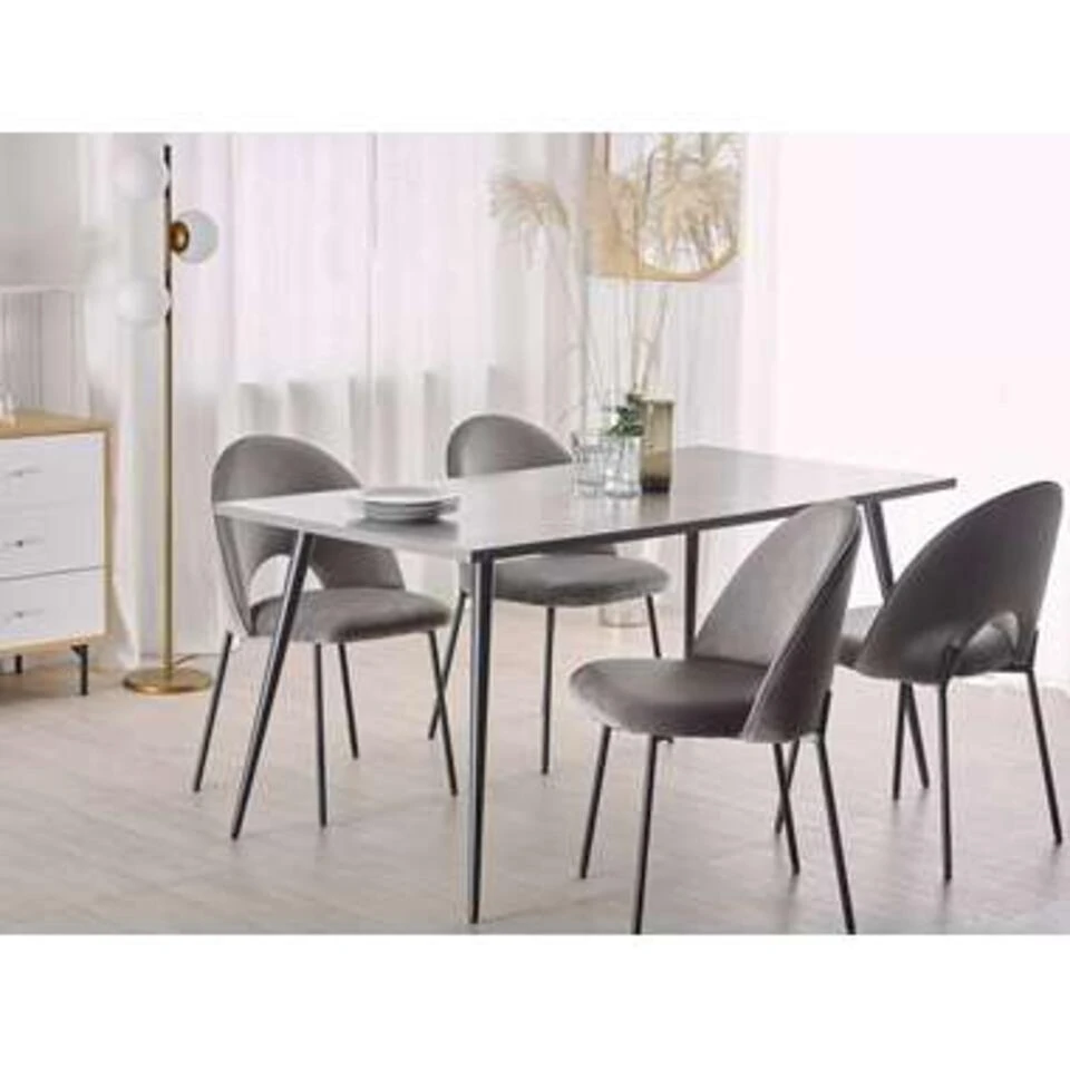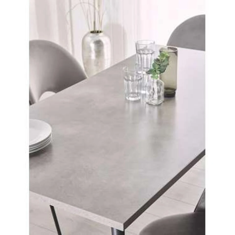 Vierkante eettafel voor 6 personen. De elegante combinatie van het tafelblad in betonlook maakt van deze tafel een perfect object voor zowel moderne als traditionele ruimtes. Combineer deze tafel met bijpassende stoelen om een elegante eethoek te creëren, perfect voor familiebijeenkomsten of diners met vrienden.