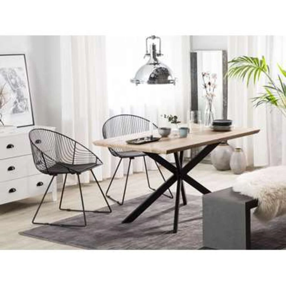 Unieke eetkamer tafel met licht houtkleurig blad en industrieel onderstel. Voeg een decoratief tintje toe aan je eethoek met deze industrieel geïnspireerde tafel. Het meubel is gemaakt van MDF in warme tinten en past perfect bij elk modern of rustiek interieur. Bovendien biedt het meubel plaats aan maximaal 6 personen, dus ideaal voor zowel een familiediner als een vriendenbijeenkomst.