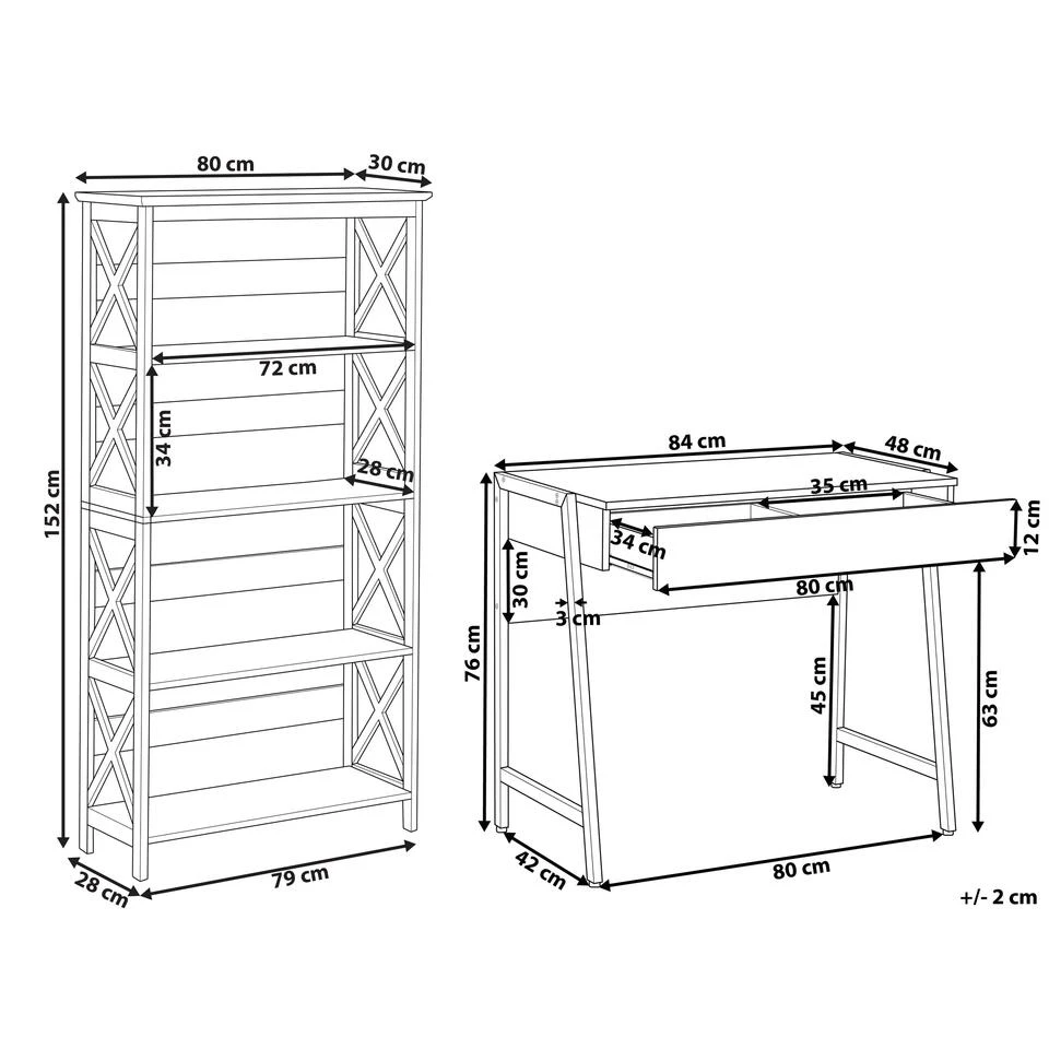 Minimalistisch bureau met bijpassende boekenkast. De Scandinavisch geïnspireerde thuiskantoorset is een perfecte aanvulling op elke studeerkamer. Het bureau is gemaakt van stevig MDF in lichte houtkleur en wit gepoedercoate stalen poten, die voor stabiliteit zorgen. Hij heeft een lade met 2 vakken en biedt je extra opbergruimte en helpt je om al je kantoor- of studeerspullen goed te organiseren. Terwijl de boekenkast strakke, vloeiende lijnen, wit afgewerkt MDF en een geometrisch ontwerp biedt: dit stuk is een must-have voor elke liefhebber van interieurdesign. Het stevige industriële frame en de brede, stevige planken bieden voldoende opbergruimte voor het organiseren van je spullen, het presenteren van foto’s of spullen en het tentoonstellen van je favoriete boeken. Het tijdloze design en de compacte vorm van de set passen goed in elke ruimte met beperkte ruimte.