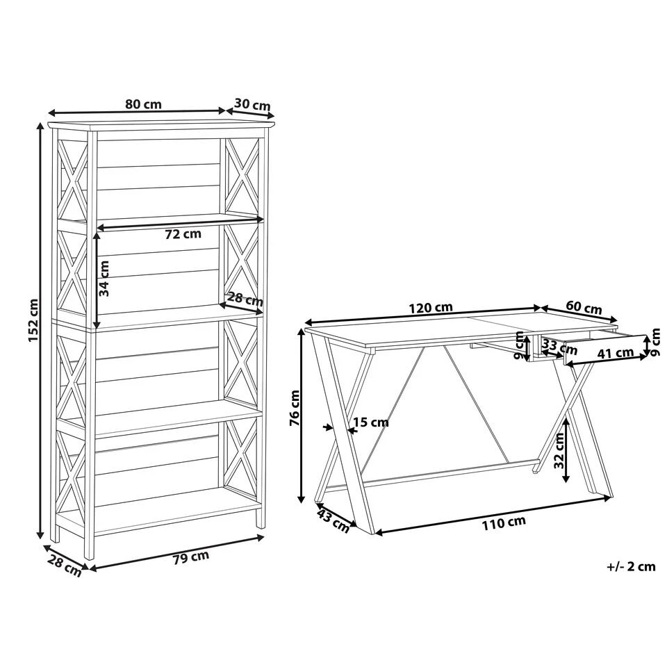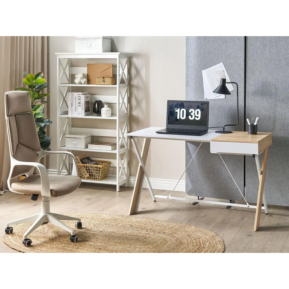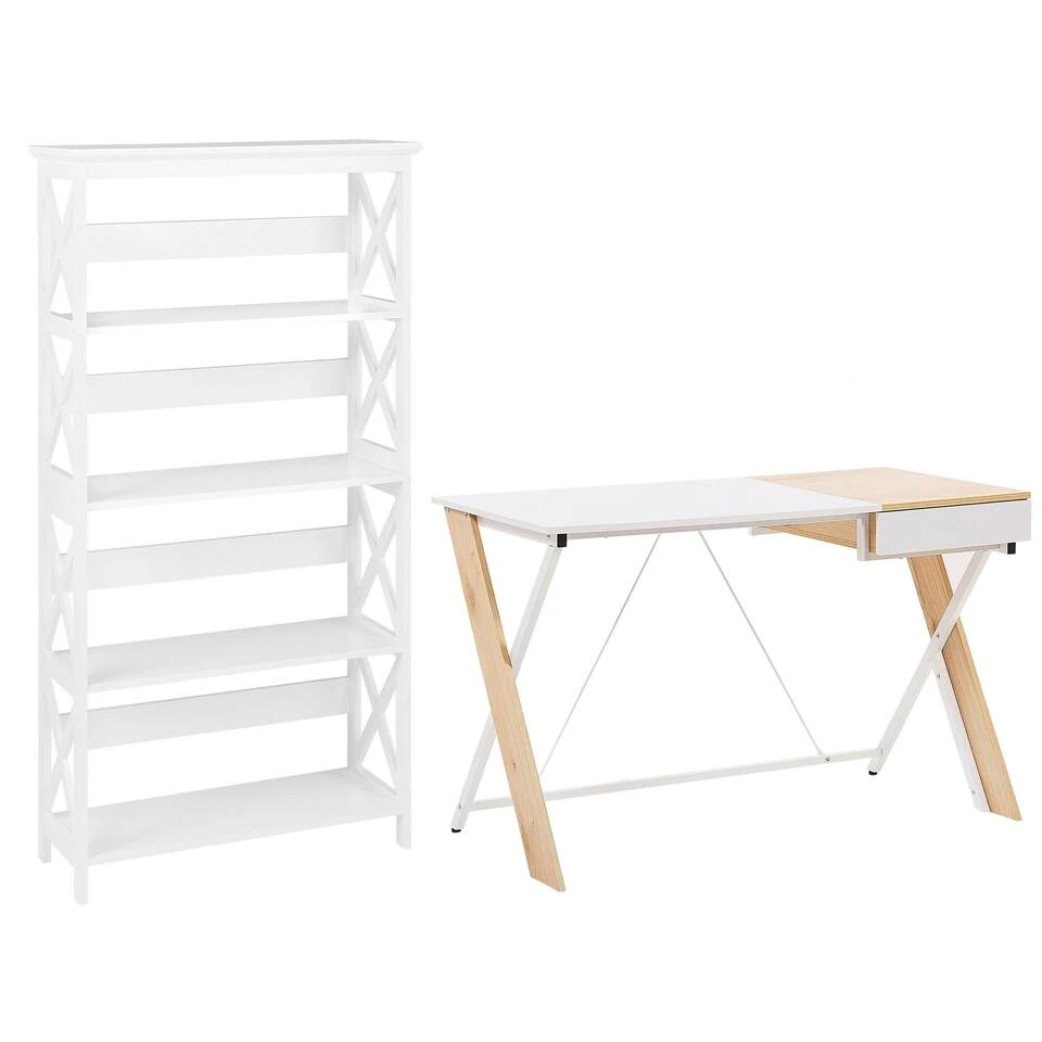 Minimalistisch bureau met bijpassende boekenkast. Creëer een thuiskantoorruimte die je helpt je te concentreren op je dagelijkse taken en die ook een stijlvol onderdeel van het interieur is. Een bureau voor thuis ontworpen met een breed blad met een functionele lade en geplaatst op een kriskras metalen frame. Dit stuk biedt voldoende ruimte voor een laptop, boeken, schrijfwaren of een tafellamp. De boekenkast die bij de set wordt geleverd, biedt strakke, vloeiende lijnen, wit afgewerkt MDF en een geometrisch ontwerp: dit stuk is gewoon een must-have voor elke liefhebber van interieurdesign. De universele kleurstelling van wit met licht hout geeft deze set een Scandinavisch gevoel dat perfect past bij verschillende ontwerpen.