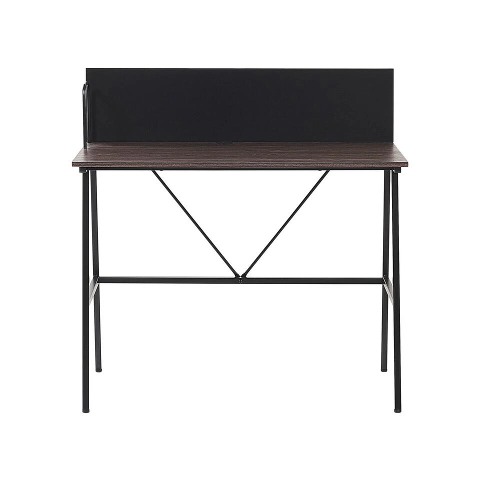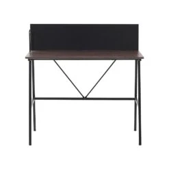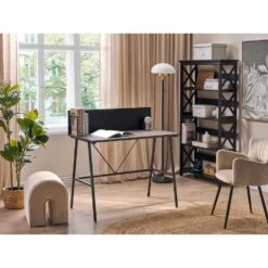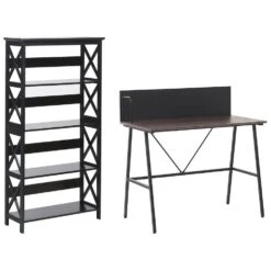Modern bureau met bijpassende boekenkast. Deze stijlvolle bureauset is het perfecte formaat voor kamers met beperkte ruimte. Het bureau is gemaakt van spaanplaat met prachtige houtachtige afwerking en gepoedercoate stalen poten voor een industrieel gevoel. Het stevige frame van de boekenkast is zwart geverfd en biedt veel opbergruimte voor bijvoorbeeld je favoriete boeken. Dankzij het tijdloze ontwerp past deze set zowel in een tienerkamer als in een thuiswerkkantoor.