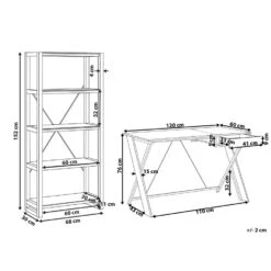 Minimalistisch bureau met bijpassende boekenkast. Creëer je eigen thuiskantoorhoekje met deze set stijlvolle meubels. Dit bureau is ontworpen met een breed blad met een functionele en ruime lade, geplaatst op een kriskras metalen frame. Dit stuk biedt voldoende ruimte voor een laptop, boeken, schrijfwaren of een tafellamp. De boekenkast wordt geleverd met 4 ruime glazen planken waar je niet alleen je documenten maar ook souvenirs, foto’s en andere decoratieve spullen in kwijt kunt. De set is gemaakt van bewerkt hout, dat duurzaam is en eenvoudig onderhoud vereist om vele jaren mee te gaan. Het universele kleurenschema van wit met licht hout geeft het een Scandinavisch, minimalistisch gevoel dat geweldig past bij verschillende interieurontwerpen.