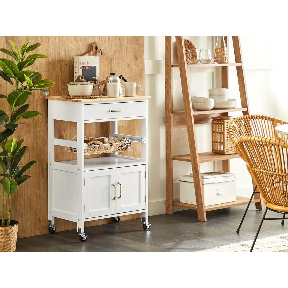 Hoge keukentrolley met 1 lade en een kast. Deze klassieke opbergtrolley is een handige en functionele toevoeging die niet alleen handig kan lijken in de keuken, maar ook in andere delen van je huis. Een ruime lade en kast passen in het bestek, servies, flessen of potten, het uittrekbare mandrek is een perfecte plek voor textiel of fruit. Plaats wat accessoires en decoraties op het rubberhouten blad en de natuurlijke uitstraling zal hun schoonheid mooi benadrukken. Dankzij de ingebouwde wielen kan het stuk gemakkelijk worden verplaatst en kan het als serveertafel dienen wanneer je gasten langskomen.