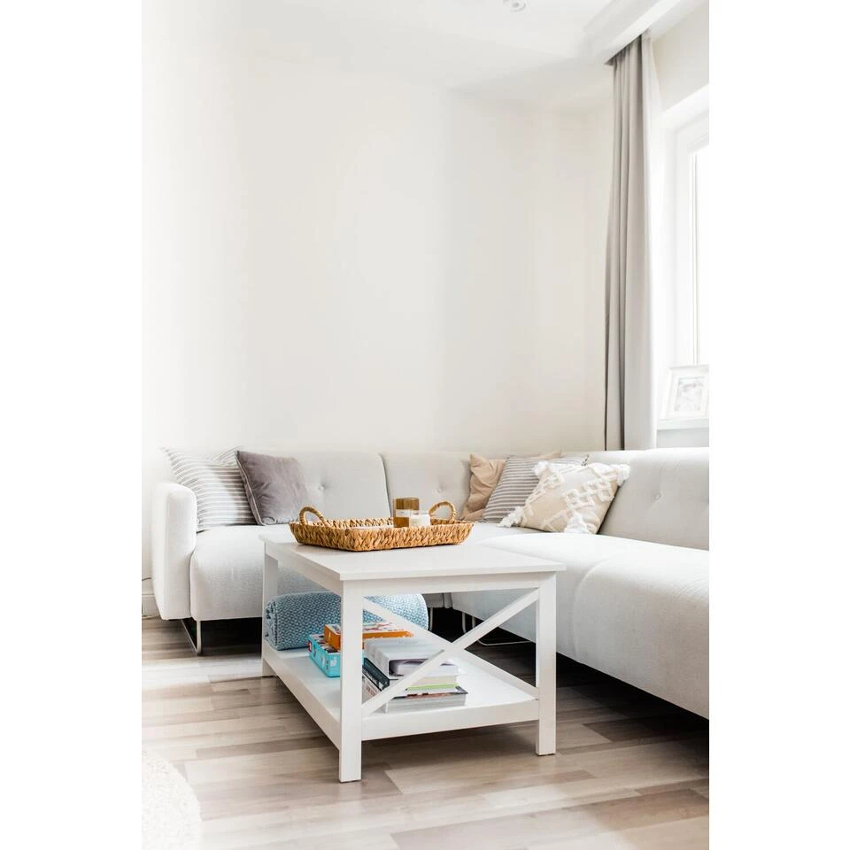 Witte salontafel in klassieke stijl. Deze ongewone salontafel die moderne stedelijke stijl combineert, zal zeker een vleugje elegantie toevoegen aan je huis. Het heeft een glad rechthoekig tafelblad van onderhoudsvriendelijk MDF en is afgewerkt met een decoratief element aan de zijkant. Op de handige plank aan de onderkant kan je je spullen opbergen en je ruimte georganiseerd houden. De donkere afwerking zorgt voor een geraffineerde uitstraling die mooi samengaat met andere decoraties in de kamer.