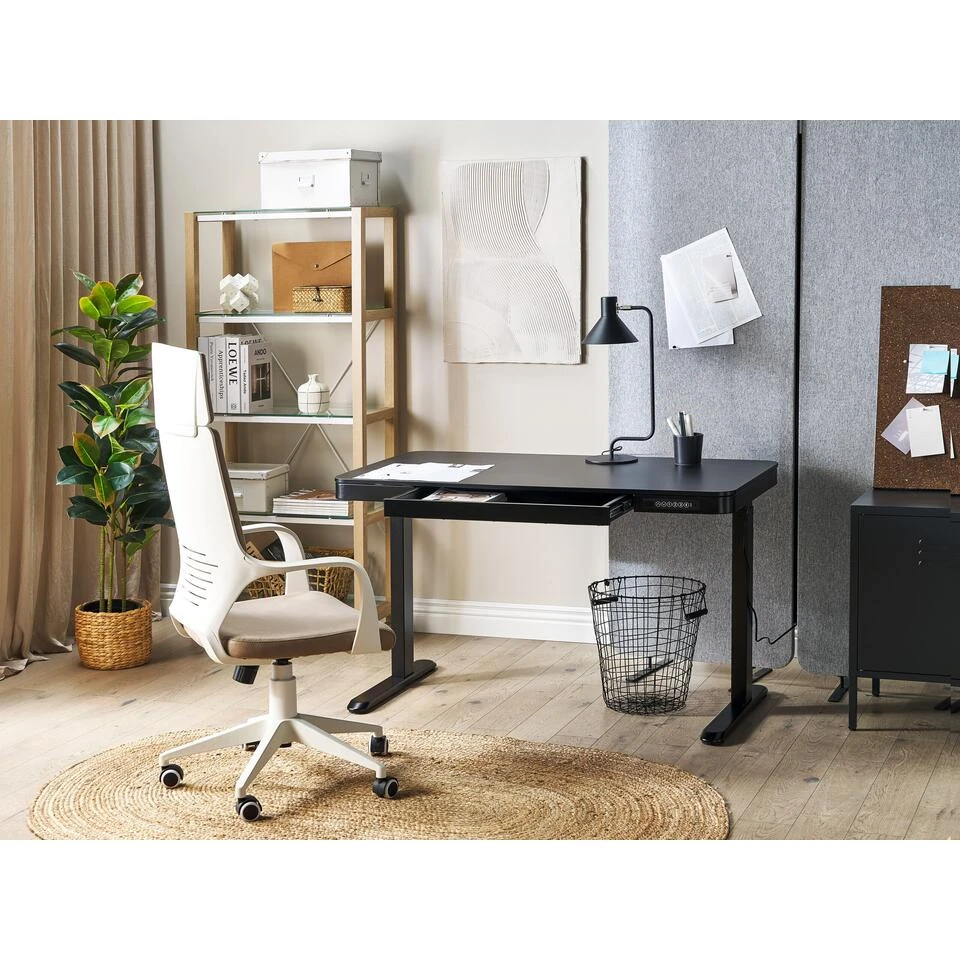 In hoogte verstelbaar bureau. Met dit moderne bureau verbeter je de kwaliteit van je werk. Het bureau is uitgerust met een LED-display en een intelligent mechanisme voor hoogteverstelling, waardoor het bureau in hoogte kan worden versteld tot wel vier verschillende niveaus. Dankzij het verstelmechanisme kun je zowel zittend als staand werken. Daarnaast zijn er USB- en USB C-type aansluitingen naast het bedieningspaneel van de tafel. Een handige doos die opent met een druk helpt om de werkruimte te ordenen. Het tafelblad is gemaakt van hoogwaardig spaanplaat met een houtachtige afwerking en het frame is gemaakt van staal, wat stabiliteit en duurzaamheid garandeert.