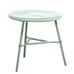 Dit ronde bijzettafeltje is gemaakt van metaal en kunststof. Het heeft een glazen blad, waardoor je veilig je lekkerste drankjes erop kunt zetten. Door dit onderhoudsvrije materiaal is dit bijzettafeltje geschikt voor zowel binnen als buitengebruik. De lichtgroene kleur is de trendkleur van dit seizoen en zorgt voor kleur en warmte in je interieur. Het tafeltje is compact en handzaam, waardoor je het makkelijk kunt verplaatsen.