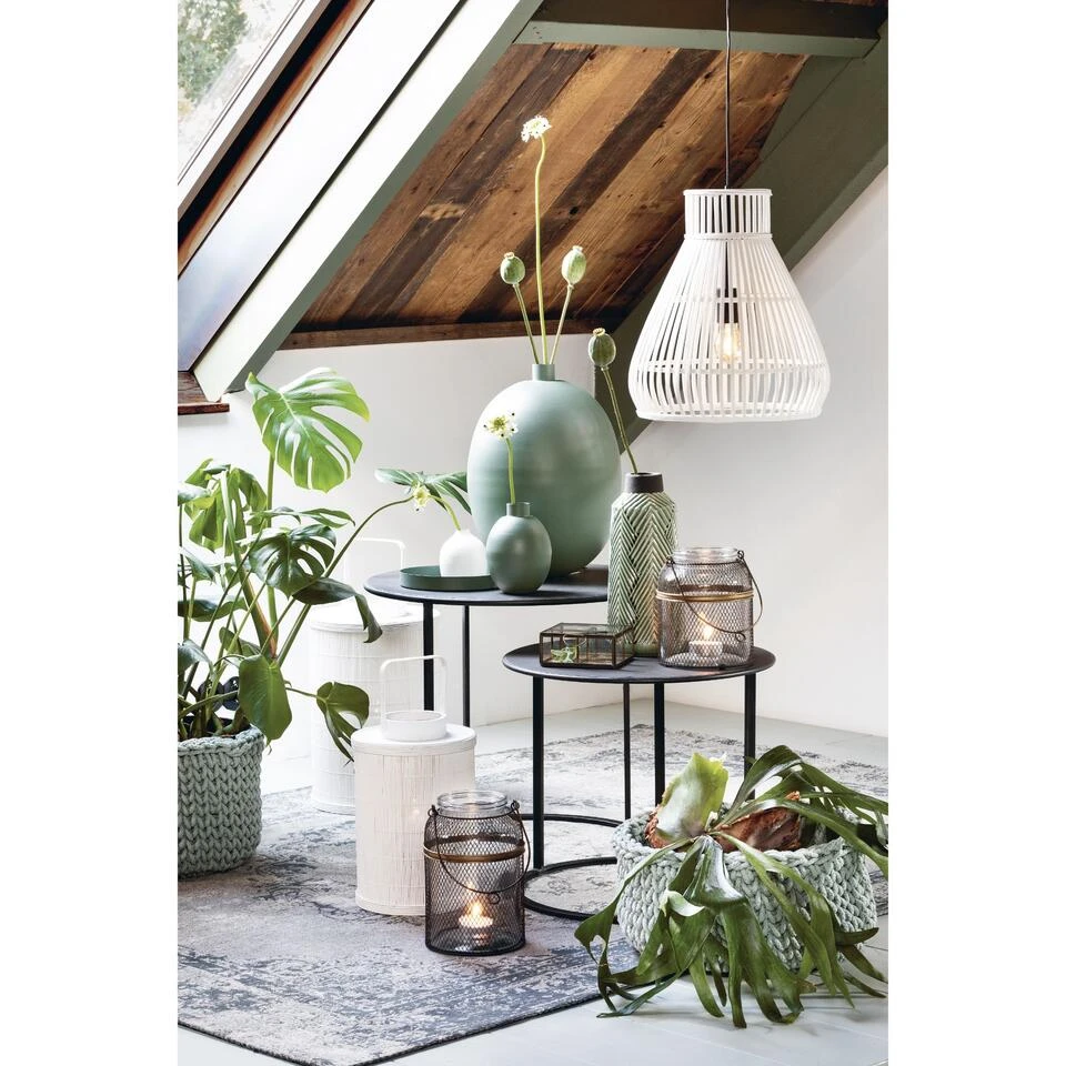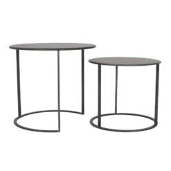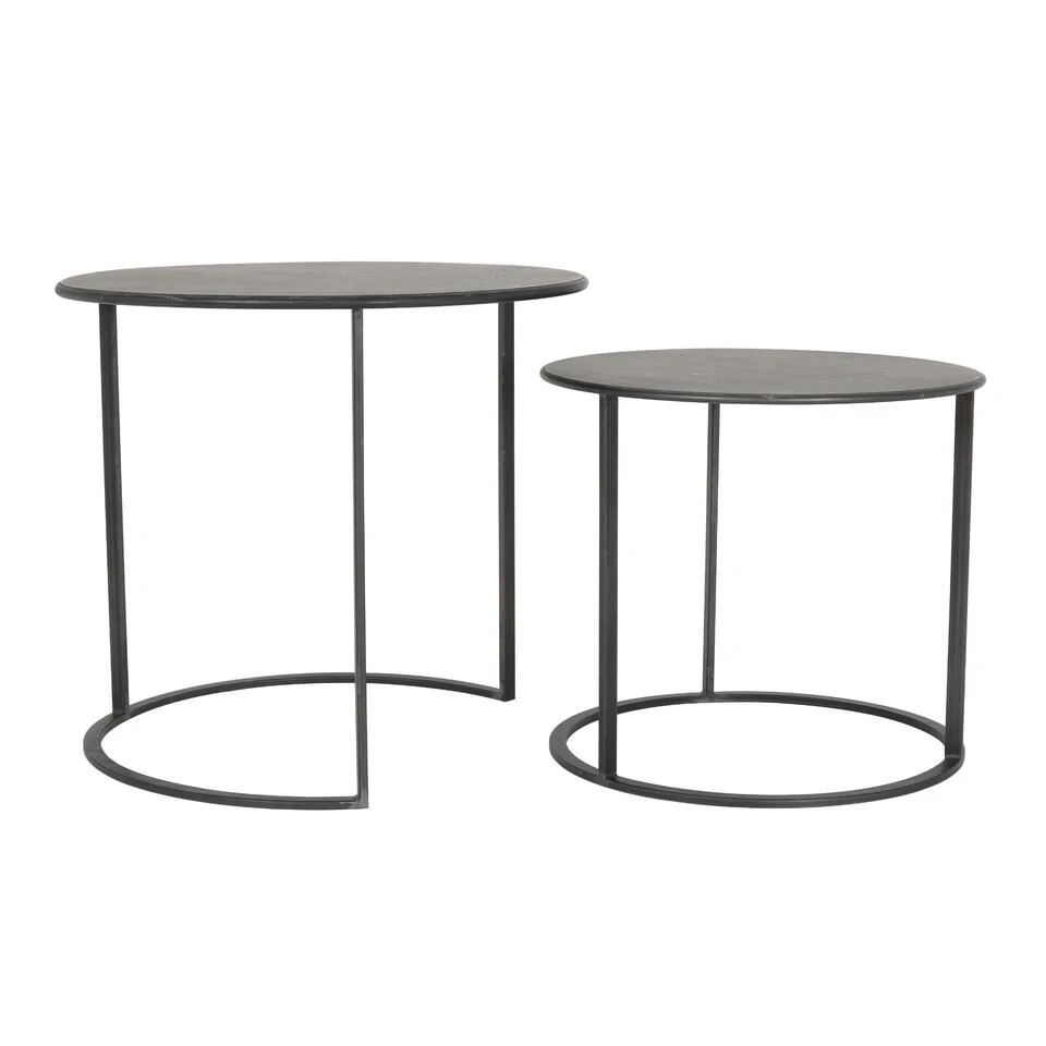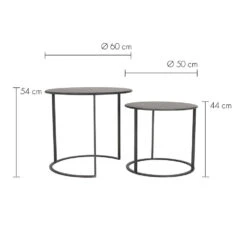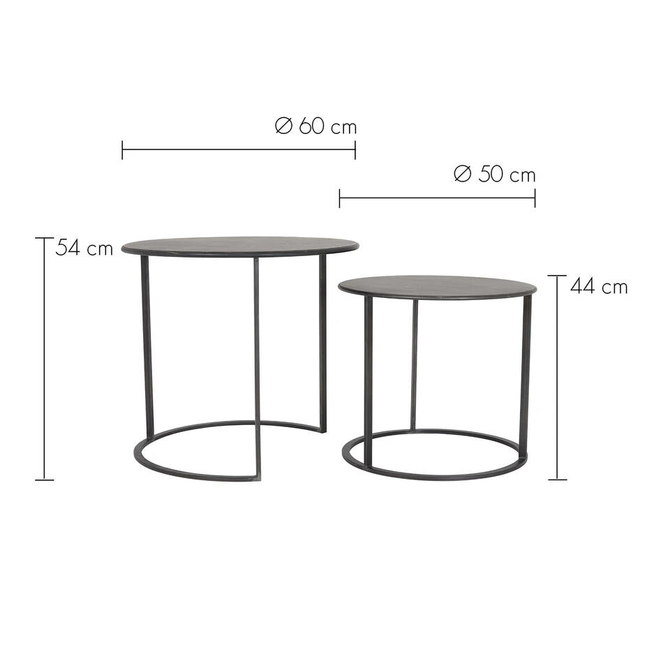 De Tilivi bijzettafel in de kleur zwart creëert een moderne en industriële look. De ronde vorm van de tafels zorgt voor een ruimtelijk gevoel in de kamer. De Tilivi bijzettafel wordt geleverd in een set van 2 en zijn gemakkelijk naar wens in elkaar te schuiven. De grootste tafel heeft een hoogte van 54 cm en een diameter van 60 cm. De tweede tafel is 44 cm hoog en heeft een doorsnede van 50 cm.