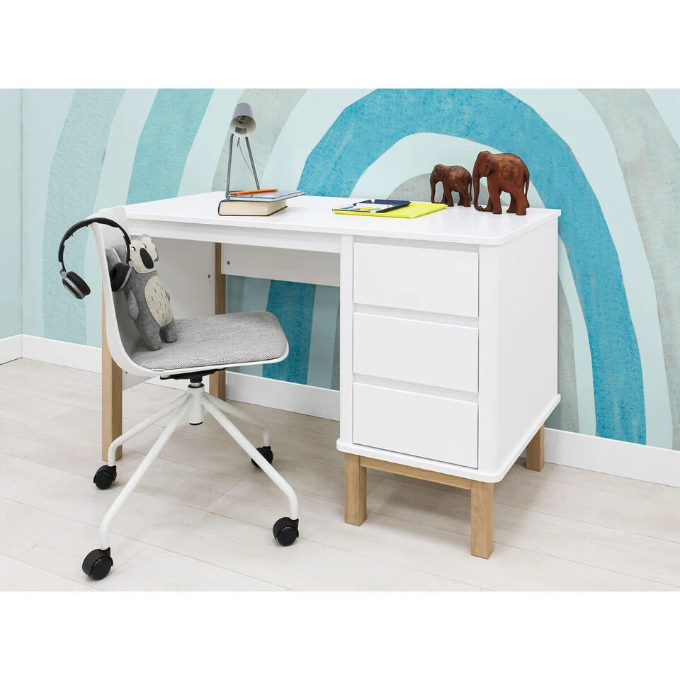 Kenmerkend voor de serie Mika zijn de eikenhouten accenten en subtiele afrondingen. Het ruime werkblad van bureau Mika biedt genoeg ruimte om huiswerk aan te maken of om te knutselen. Het bureau is voorzien van drie ruime lades. De lades zijn greeploos uitgevoerd. Na het maken van huiswerk, of knutselen kunnen alle spullen netjes opgeborgen worden! Het bureau is afgewerkt met een lak op waterbasis, kind- en milieuvriendelijk. Combineer dit bureau Mika met de andere meubels van dezelfde serie.