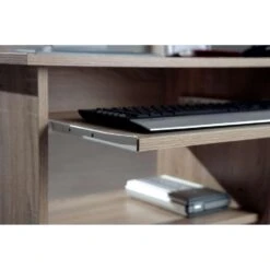 Bureau Durini is een zeer compacte bureau en hierdoor geschikt voor de allerkleinste kamers in huis. Het handige bureau is verplaatsbaar aan de hand van de vier zwenkwieltjes aan de onderkant. Het bureau is opgebouwd uit spaanplaat en heeft een finish in Sonoma eikenhout motief. Het bureau biedt plaats voor de PC-kast aan de rechterzijde. Onder het werkblad vind je een uitschuifbaar plankje voor het plaatsen van een toestenbord. Studieboeken, multomappen en andere gerei plaats op je op de twee onderste plankjes.
