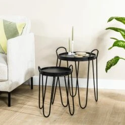 De Daito ronde salontafel set van 2 in het zwart is een prachtige set salontafels die jouw woonkamer een industrieel tintje geeft. Deze set salontafels is afkomstig van het woonmerk Vurna en is gemaakt van hoogwaardige materialen. De set bestaat uit 2 verschillende afmetingen, waarbij de grote tafel een diameter van 40cm heeft en een hoogte van 40cm, en de kleine tafel een diameter van 30cm heeft en een hoogte van 45cm. De Daito salontafels hebben hun industriële look te danken aan het gebruik van mangohout en metaal. Het mangohouten tafelblad heeft een zwarte kleur en is voorzien van een rand die ervoor zorgt dat jouw producten minder snel van de tafel af worden gestoten. Het onderstel van de tafels is gemaakt van zwart metaal en heeft vier poten die allemaal een v-vorm hebben. Dit zorgt voor een speels effect en maakt de set salontafels nog interessanter om naar te kijken. De Daito ronde salontafel set van 2 in het zwart is niet alleen geschikt als salontafel, maar kan ook worden gebruikt als bijzettafel. De set is dan ook uiterst veelzijdig en past perfect in vrijwel elke woonkamer. Het is een uitstekende keuze voor mensen die op zoek zijn naar een stijlvolle en praktische manier om hun lege ruimte een industrieel tintje te geven. Al met al is de Daito ronde salontafel set van 2 in het zwart een uitstekende keuze voor mensen die op zoek zijn naar een mooie en praktische set salontafels. Het hoogwaardige materiaal, de industriële look en het veelzijdige gebruik maken deze set een waardevolle toevoeging aan jouw interieur.