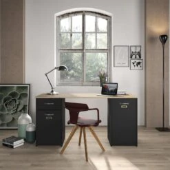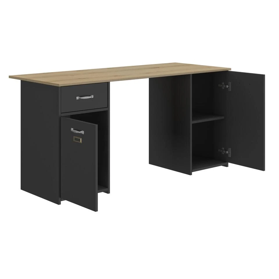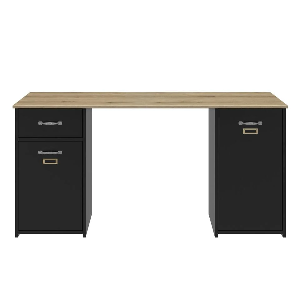 Het bureau BRISTOL is uitgerust met twee praktische opbergkasten. De eerste kast heeft een lade en een deur met een plank erachter. De tweede kast is uitgerust met een grote deur met een plank erachter. Beide deuren zijn voorzien van een metalen labelhouder om de organisatie van uw documenten te vergemakkelijken.