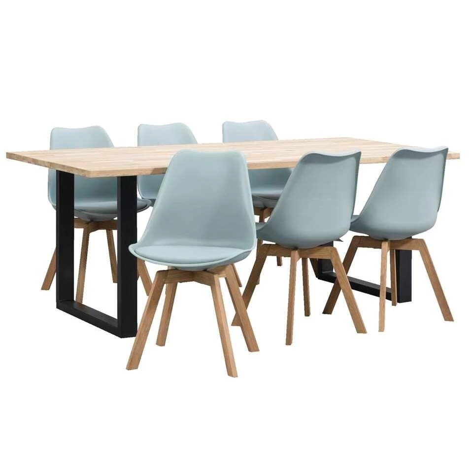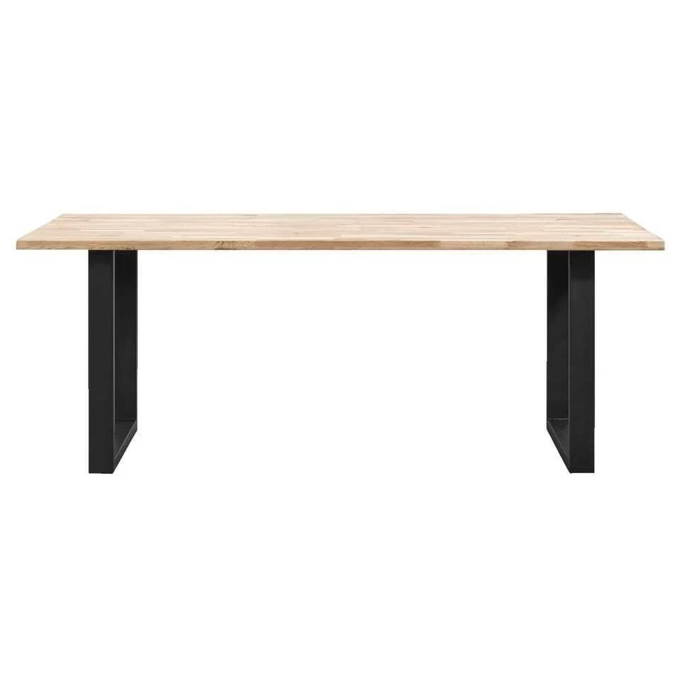 De eetkamertafel heeft een massief eiken tafelblad, sterk en met een mooie eikenprint. Daaronder zit een stevig metalen onderstel, in de vorm van een U. Hout met metaal is al enige tijd een stoere en populaire combinatie! Het tafelblad heeft een afmeting van 200×100 cm. De tafel heeft een hoogte van 74 cm en de ruimte tussen de poten is 154 cm. Let op met het kopen van bijpassende eetkamerstoelen, bijvoorbeeld qua breedte van de stoel en qua hoogte van de leuningen.Â
