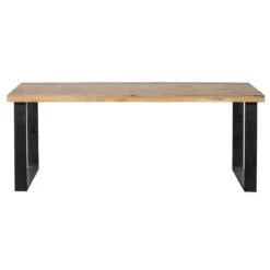 Over het mangohout worden meerdere lagen houtolie en een blanke, natuurlijke bijenwas aangebracht om het hout te beschermen tegen vocht, vuiligheid en kringen. Het blad met een dikte van 6 cm bestaat uit 3 cm massief mangohout welke met een extra strook van 3 cm dik is aangedikt. De U-poten zijn gemaakt van zwart gepoedercoat metaal en er zit 109 cm tussen de poten.