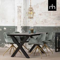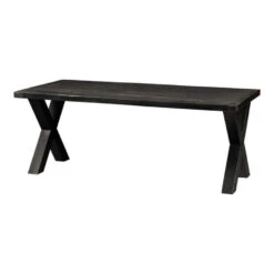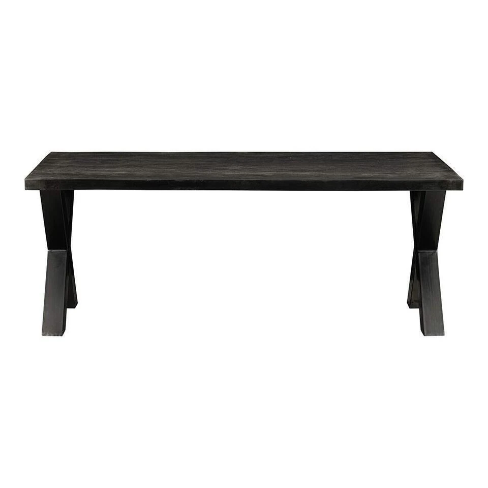 Het blad is eerst gezandstraald, waarna het behandeld wordt met zwarte verfbeits en tenslotte wordt afgewerkt met een donkere, natuurlijke bijenwas om het hout te beschermen tegen vocht, vuiligheid en kringen. Het blad met een dikte van 6 cm bestaat uit 3 cm massief mangohout en is met een extra strook van 3 cm aangedikt. De X-poten zijn gemaakt van zwart gepoedercoat metaal en er zit 108 cm tussen de poten.