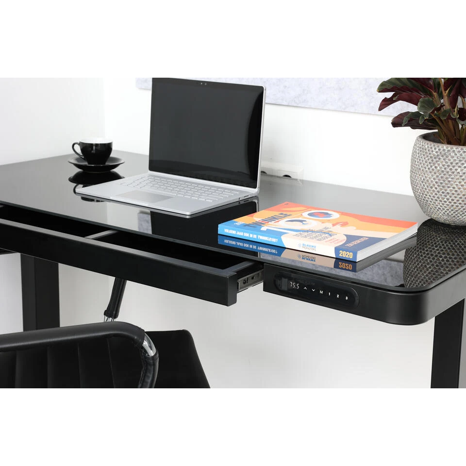 Met dit zit-sta bureau richt je in een handomdraai een ergonomische thuiswerkplek in! Het bureau is elektrisch verstelbaar door middel van twee motoren en voorzien van een digitaal bedieningspaneel met geheugenfunctie.