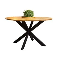Bij deze Brixon eettafel valt het bijzondere onderstel op. Het geeft een stevige look aan de tafel. Het naturel mangohouten tafelblad vormt hiermee een bijzonder contrast. Ze straalt elegantie uit en is toch zeer robuust. De ronde vormen passen bij een vintage woning, het stoere onderstel is uitstekend voor je industriële of je landelijke woonkamer. We bieden deze tafel ook aan in vierkante en ovale varianten.