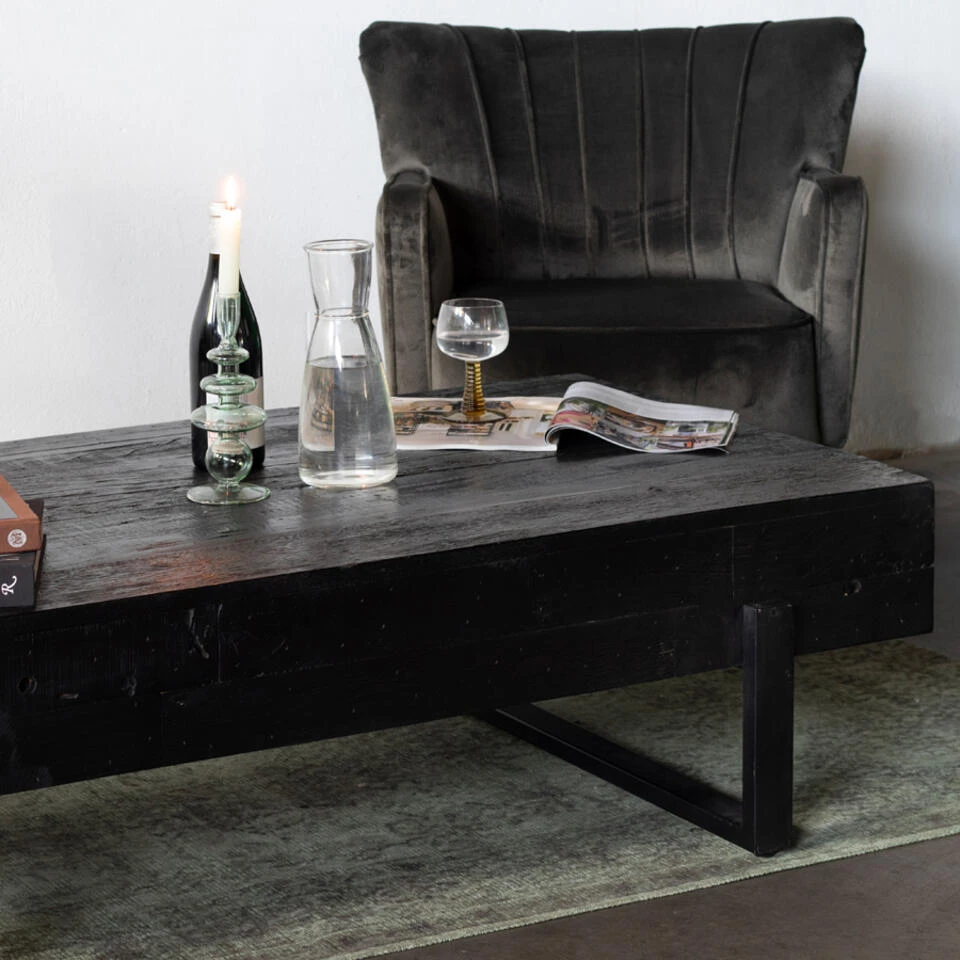 Salontafel New Vintage Zwart Stoer en industrieel. Dat is de Salontafel New Vintage! Nu ook verkrijgbaar in het zwart. Deze stoere salontafel geeft uw woonkamer een hele nieuwe uitstraling. Maat: 140x75x35 (LxBxH) Materiaal: Acacia Hard Hout Metaal Elke tafel is uniek omdat de tafel gemaakt is van gerecycled hout.