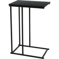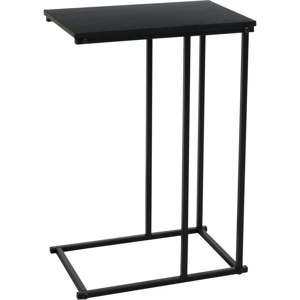 Bijzettafels/banktafel. Deze bijzettafel heeft een MDF blad op een zwart onderstel. De bijzettafel is zo vormgegeven dat deze makkelijk aan de bank te schuiven is, maar staat ook heel leuk ter decoratie met een beeld of plant er op. Deze bijzettafel moet u zelf nog in elkaar zetten. Materiaal: metaal/MDF. Afmetingen: ca. 40 x 26 x 58 cm.