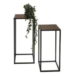 Home and Styling planten potten of vazen standaard/verhoger set, 2-delig in het zwart met bruin houten plateaus. Een laag en hoger tafeltje. Deze set bestaat uit 2 vierkante tafels. De grote tafel is ca. 27 x 27 cm breed en ca. 60 cm hoog. De kleine tafel is ca. 24 x 24 cm breed en ca. 50 cm hoog. Door dit formaat passen beide tafels in elkaar, waardoor ze gemakkelijk opgeruimd kunnen worden en het ruimte bespaart. Het onderstel van beide tafels is van metaal(ijzer), het tafelblad is MDF.
