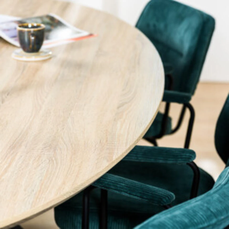 Deze trendy eetkamertafel is uitgevoerd in MDF met een white wash en een zwart metalen onderstel. Het robuuste onderstel is gemaakt van zwart gepoedercoat metaal. Het blad is uitgesneden in een rechthoekige vorm en het metalen frame bedekt de zijkant van de tafel dit geeft de tafel een stoere look. De combinatie van het elegante blad en het stoere onderstel zorgt ervoor dat de tafel in veel verschillende stijlen tot zijn recht komt. Deze tafel zorgt ervoor dat tafelen nog leuker wordt!