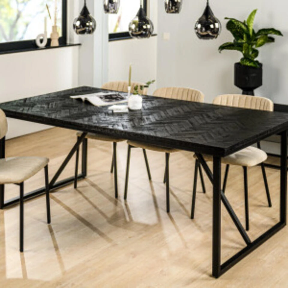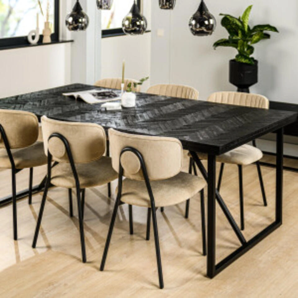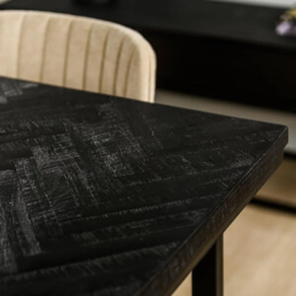 Deze trendy eetkamertafel is uitgevoerd in kwalitatief Teak hout in een vissengraat patroon en een zwart metalen onderstel. Het robuuste onderstel is gemaakt van zwart gepoedercoat metaal. Het blad is uitgesneden in een rechthoekige vorm en het metalen frame bedekt de zijkant van de tafel dit geeft de tafel een stoere look. De combinatie van het elegante blad en het stoere onderstel zorgt ervoor dat de tafel in veel verschillende stijlen tot zijn recht komt. Deze tafel zorgt ervoor dat tafelen nog leuker wordt!