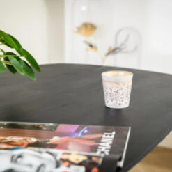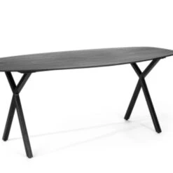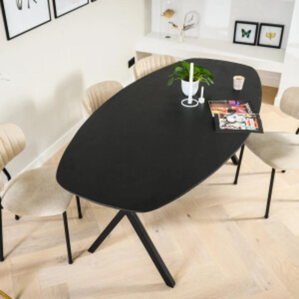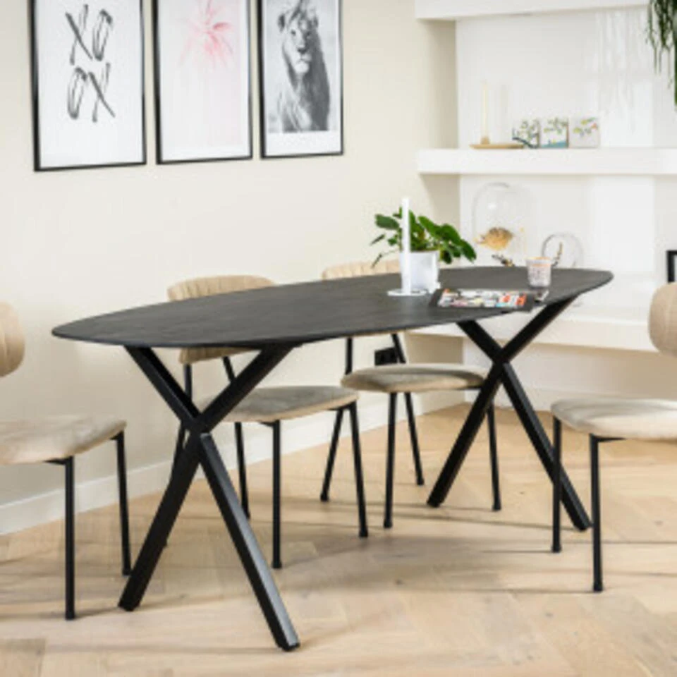 Deze trendy zwarte eetkamertafel is uitgevoerd in kwalitatief mango hout en een zwart metalen onderstel. Het robuuste onderstel is gemaakt van zwart gepoedercoat metaal. Het blad is uitgesneden in een deens ovale vorm en loopt dun af waardoor het blad een hele strakke look heeft. De combinatie van het elegante blad en het stoere onderstel zorgt ervoor dat de tafel in veel verschillende stijlen tot zijn recht komt. Deze tafel zorgt ervoor dat tafelen nog leuker wordt!