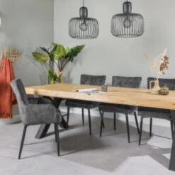 Deze trendy eetkamertafel is uitgevoerd in met een hoogwaardig eieken blad en een zwart metalen onderstel. Het robuuste onderstel is gemaakt van zwart gepoedercoat metaal. Het blad is uitgesneden in een rechthoekige vorm en het metalen frame bedekt de zijkant van de tafel dit geeft de tafel een stoere look. De combinatie van het elegante blad en het stoere onderstel zorgt ervoor dat de tafel in veel verschillende stijlen tot zijn recht komt. Deze tafel zorgt ervoor dat tafelen nog leuker wordt!